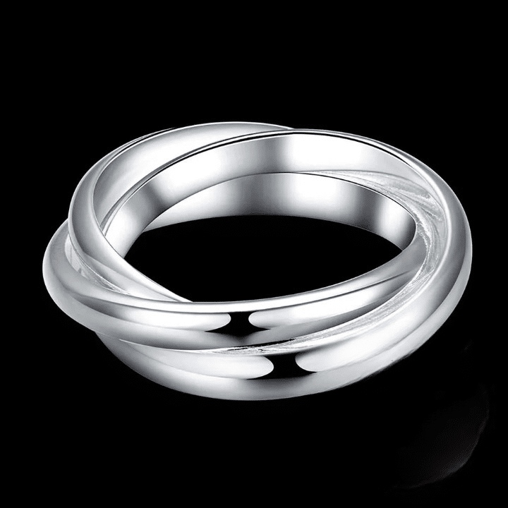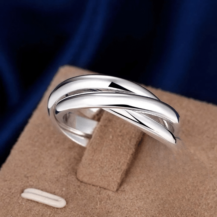 Cette bague couple 3 anneaux argent présente un design chic et intemporel avec trois anneaux fins qui s’entrelacent pour créer un mouvement fluide et harmonieux autour du doigt.