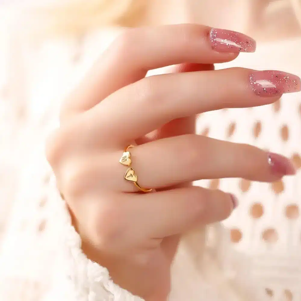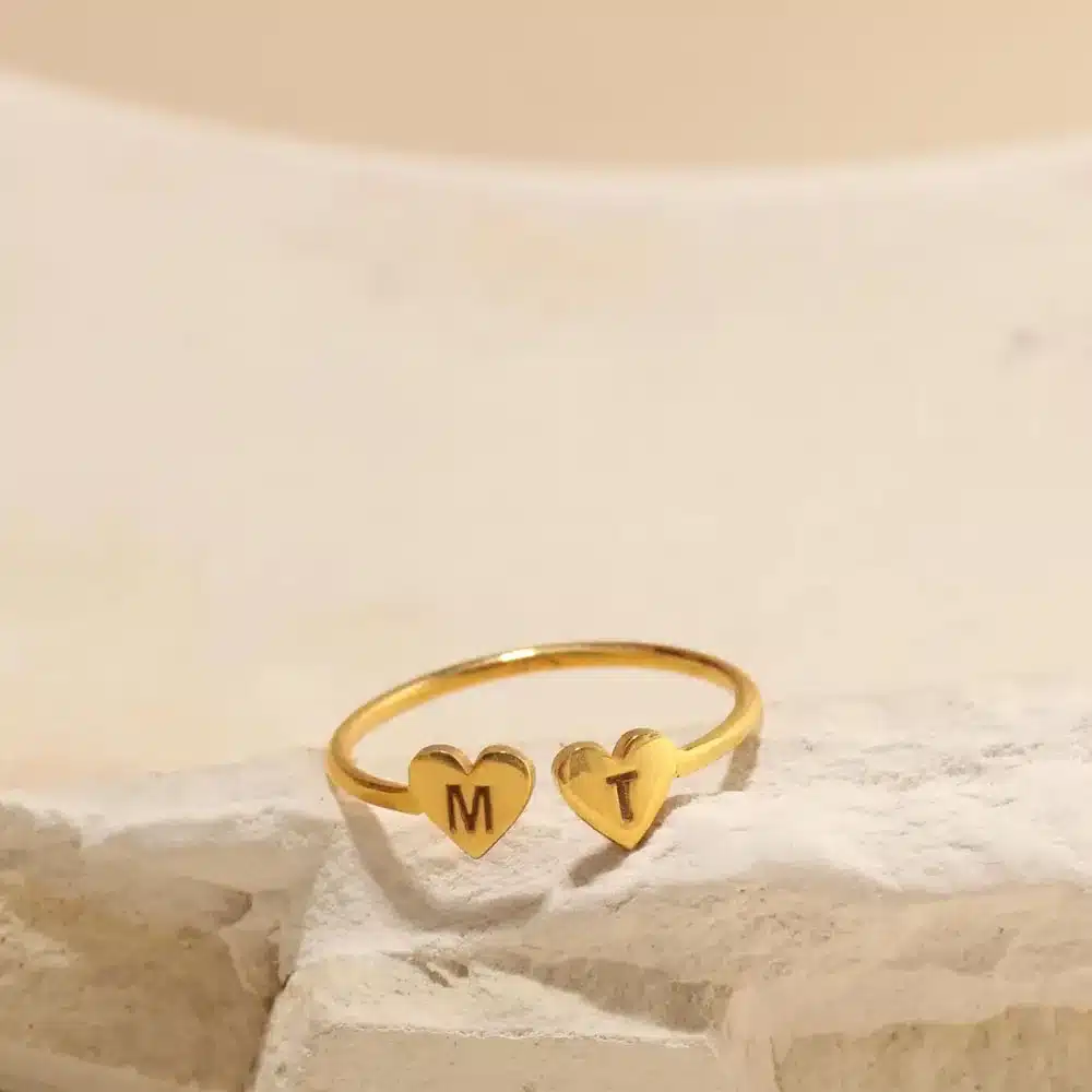 Cette bague couple cœur initiales se compose de deux petits cœurs côte à côte, chacun accueillant une initiale gravée de votre choix.