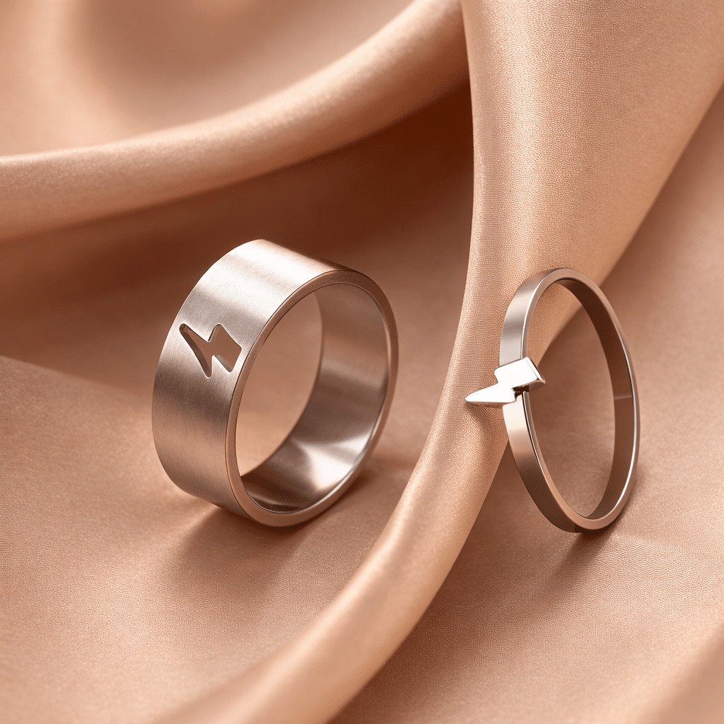 Chaque bague couple éclair adopte un design minimaliste et moderne, avec un motif éclair découpé qui s’aligne parfaitement lorsque les deux anneaux sont réunis.