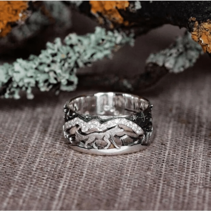 Chaque bague couple GOT est ornée de motifs de loups finement sculptés, emblème de la famille Stark, avançant ensemble sous un ciel étoilé et des reliefs montagneux.