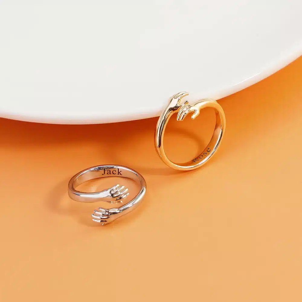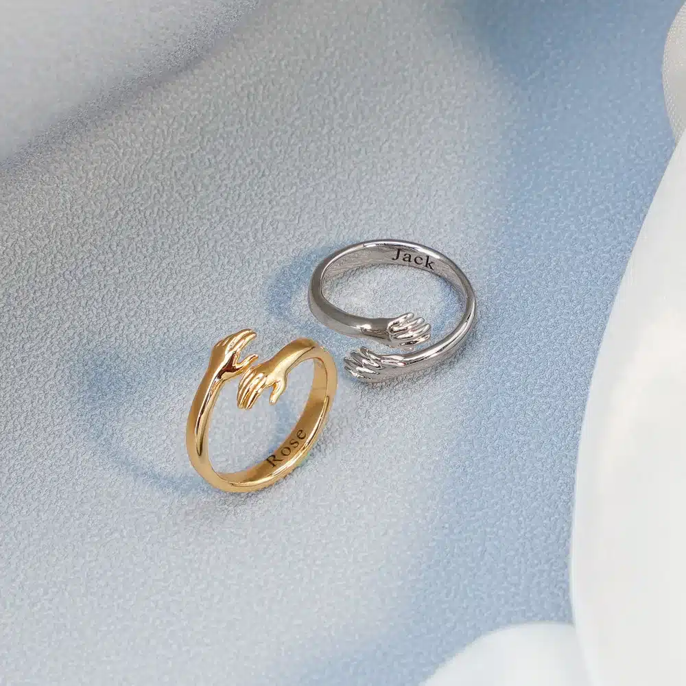 La bague couple main personnalisée est fabriquée en acier inoxydable plaqué or ou argent, ce qui garantit une belle tenue dans le temps.