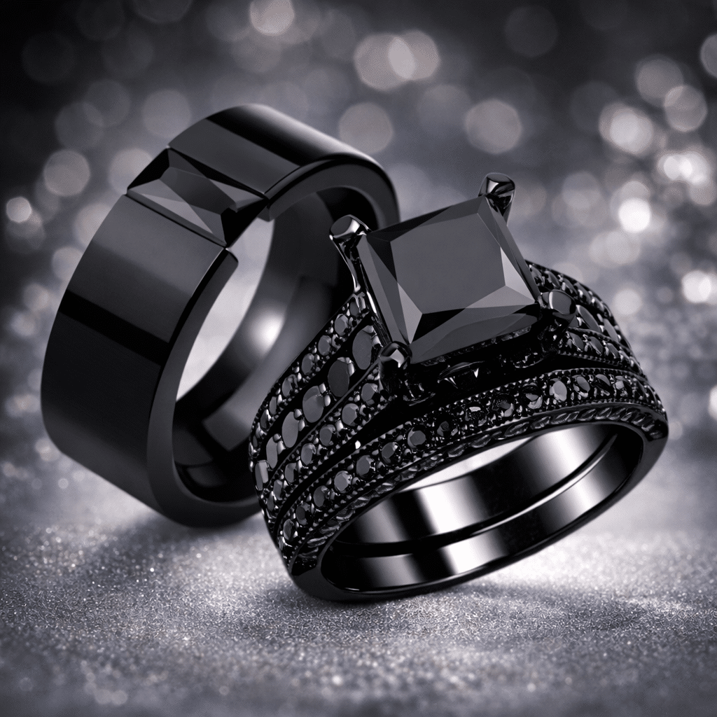 Acier inoxydable noir, zirconium et pierre de lune s’associent pour créer ces bagues couple pierre de lune au style intense et élégant.