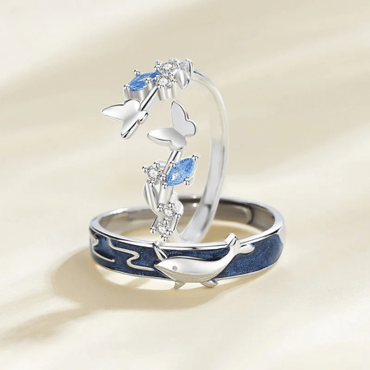 La seconde bague de couple papillon, plus sobre, présente un adorable dauphin argenté qui nage dans un océan bleu profond.