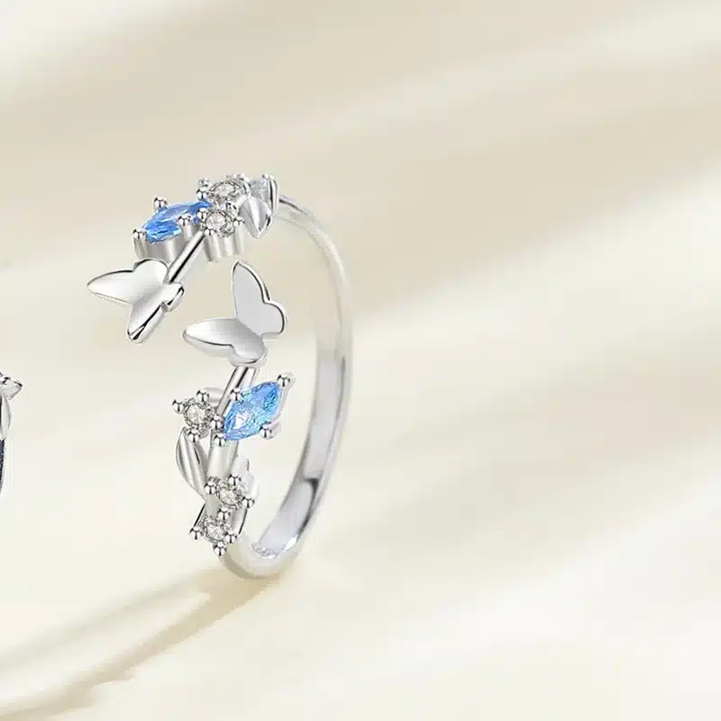La première bague, féminine et délicate, est ornée de plusieurs papillons argentés et de petites pierres bleu clair qui évoquent la légèreté et la liberté.