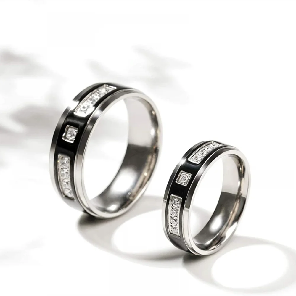 Fabriquées en acier inoxydable plaqué argent et zirconium, ces bagues de couple rectangulaire sont solides et gardent leur brillance.