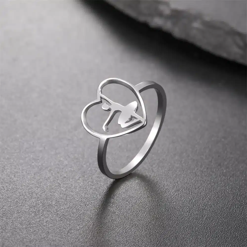 Cette bague de promesse ballerine femme affiche un motif en forme de cœur ouvert intégrant la silhouette d’une ballerine qui apporte une touche artistique et délicate au bijou.