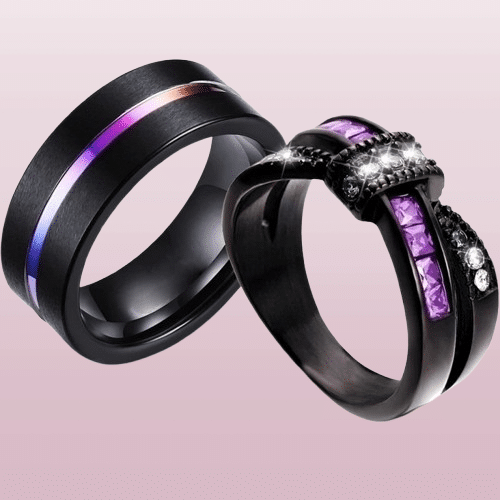 La bague de promesse violette pour couple se compose d’un lot de deux bagues noires assorties qui forment un ensemble coordonné parfait pour symboliser votre engagement.