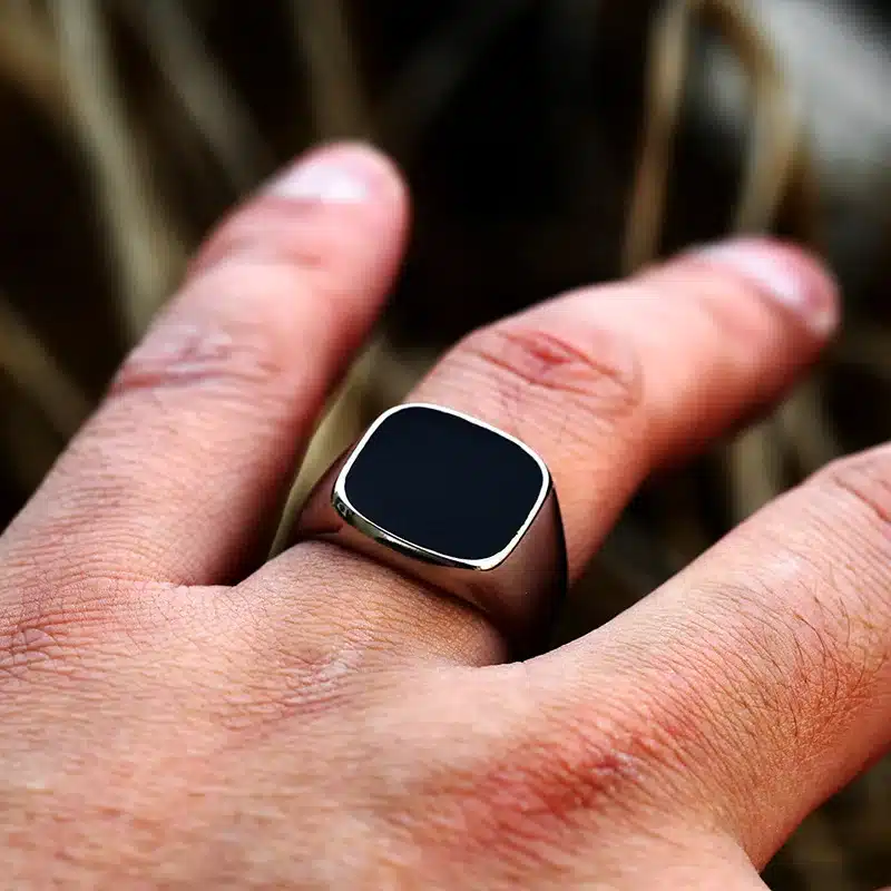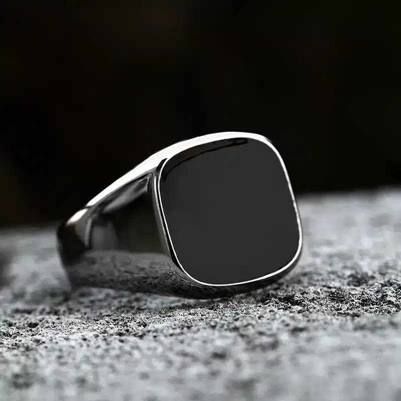Chaque bague présente une pierre noire lisse et polie montée sur un anneau argenté qui crée un contraste raffiné.