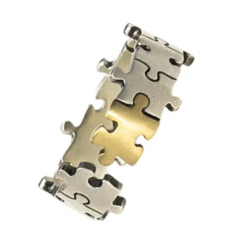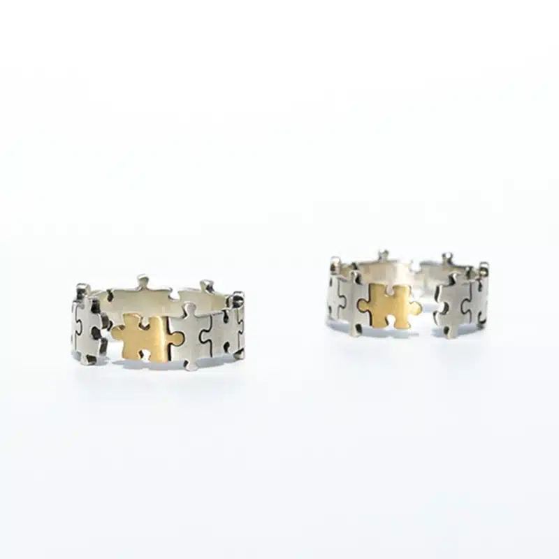 Ce lot de deux bagues puzzle couple présente un design symbolique et unique où chaque anneau est décoré d’un motif puzzle argenté avec une pièce dorée au centre qui représente la partie manquante de l’autre.