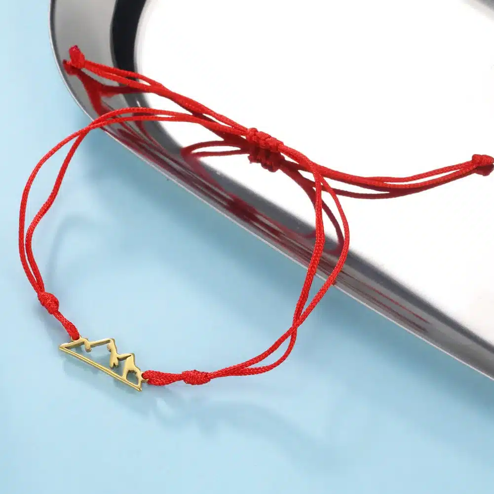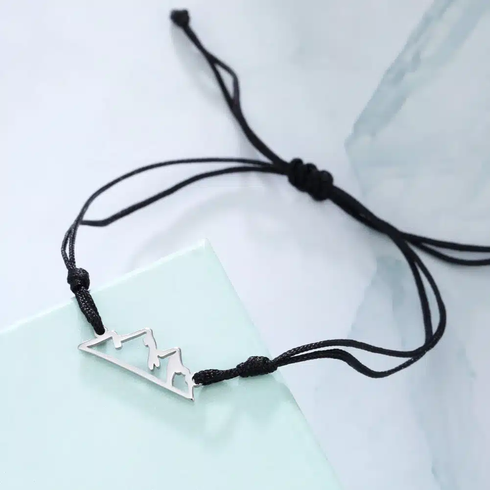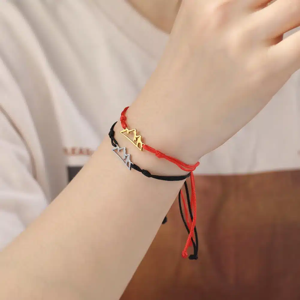 Le bijou bracelet identique homme femme couple comprend un bracelet rouge avec un pendentif montagne doré et un bracelet noir avec un pendentif montagne argenté.
