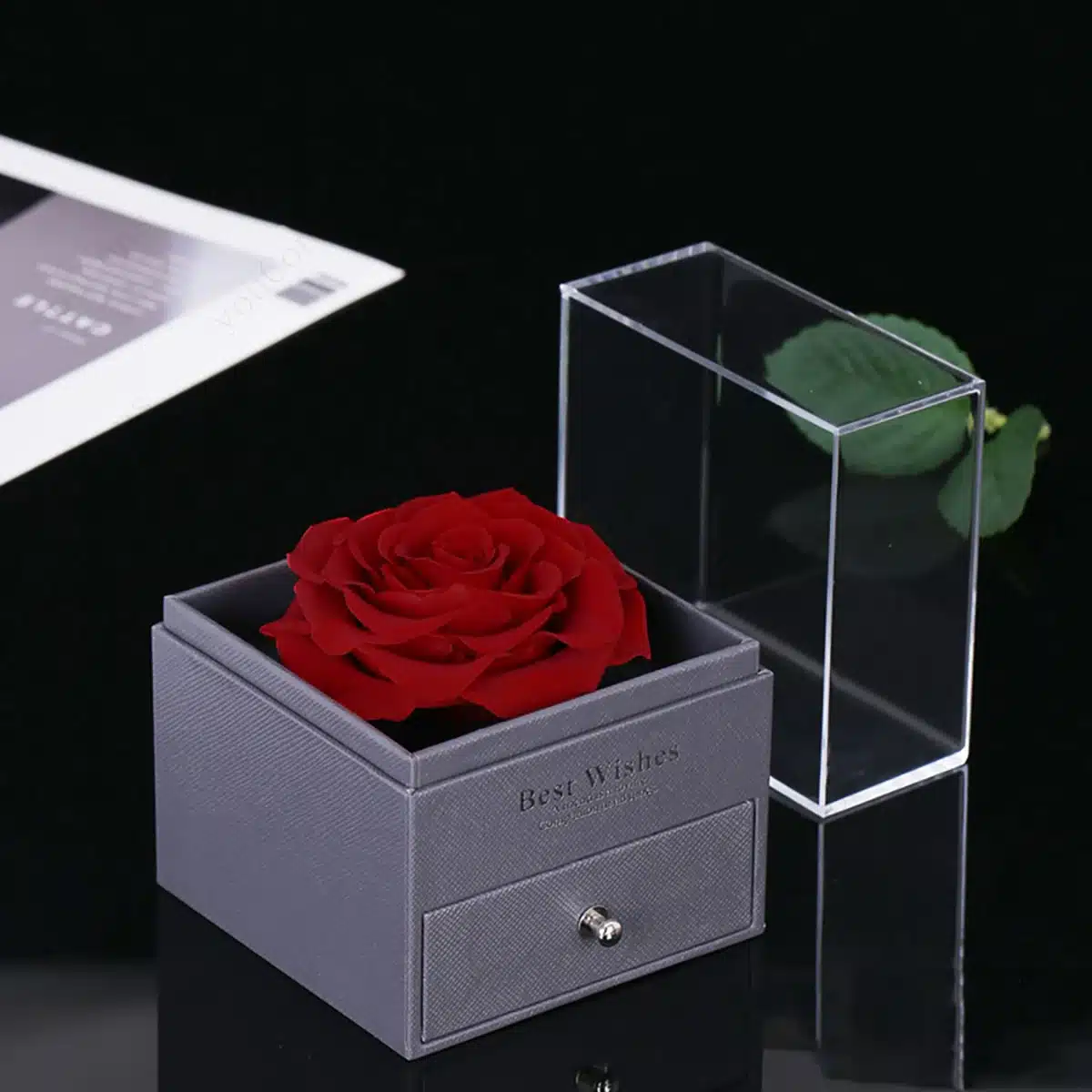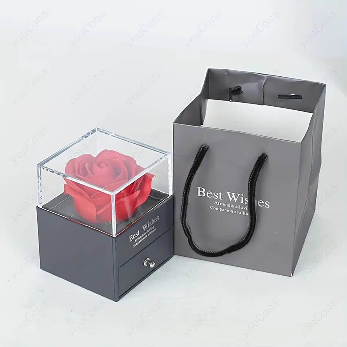 Fabriquée en fleurs de savon et PVC, elle ne fane jamais et garde son apparence intacte sans entretien, ce qui permet de conserver un symbole d’amour durable au fil du temps.