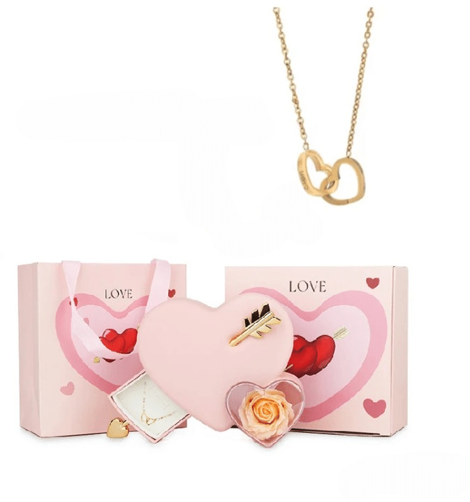 Le coffret inclut aussi un collier avec pendentif double cœur sur une chaîne à maillons de 45 cm, disponible en trois finitions : rose gold, doré ou argent.