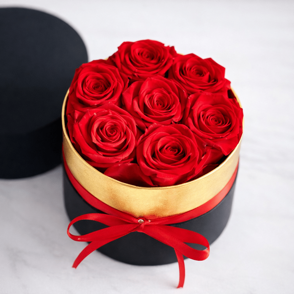 À l’intérieur, 7 roses éternelles rouges sont parfaitement disposées pour former un bouquet élégant et prêt à offrir.