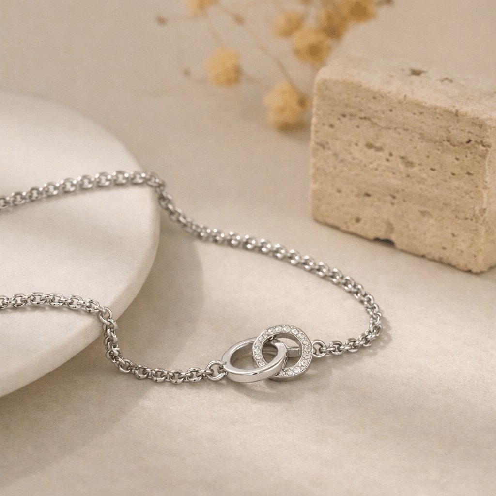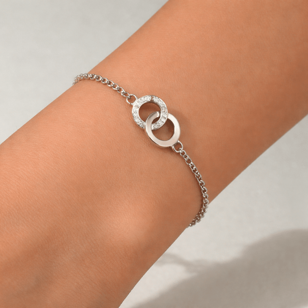 Ce bracelet argenté pour femme se distingue par son pendentif deux anneaux entrelacés, un symbole fort d’union et de lien durable, porté de façon discrète et élégante au poignet.