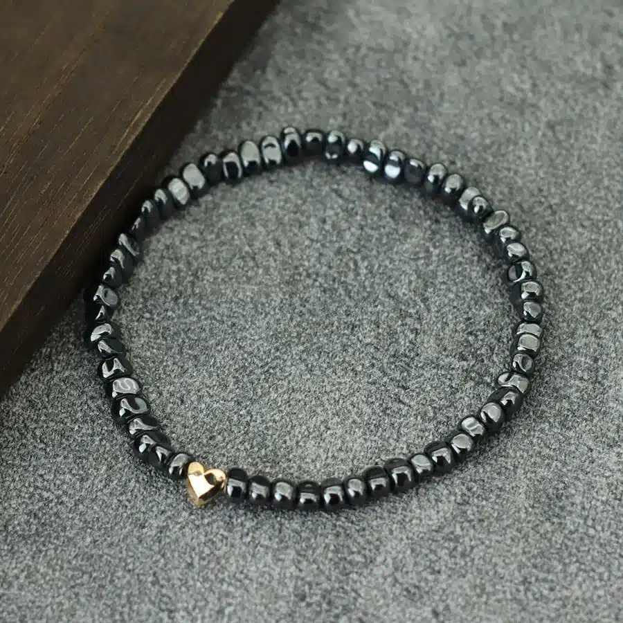 Chaque bracelet est composé de perles de pierres noires naturelles, au rendu lisse et raffiné, ponctuées d’un petit cœur métallique qui vient apporter une touche d’émotion et de contraste.