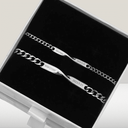 Le bracelet couple avec date est un duo de bracelets gourmettes conçu pour marquer une date importante à deux.