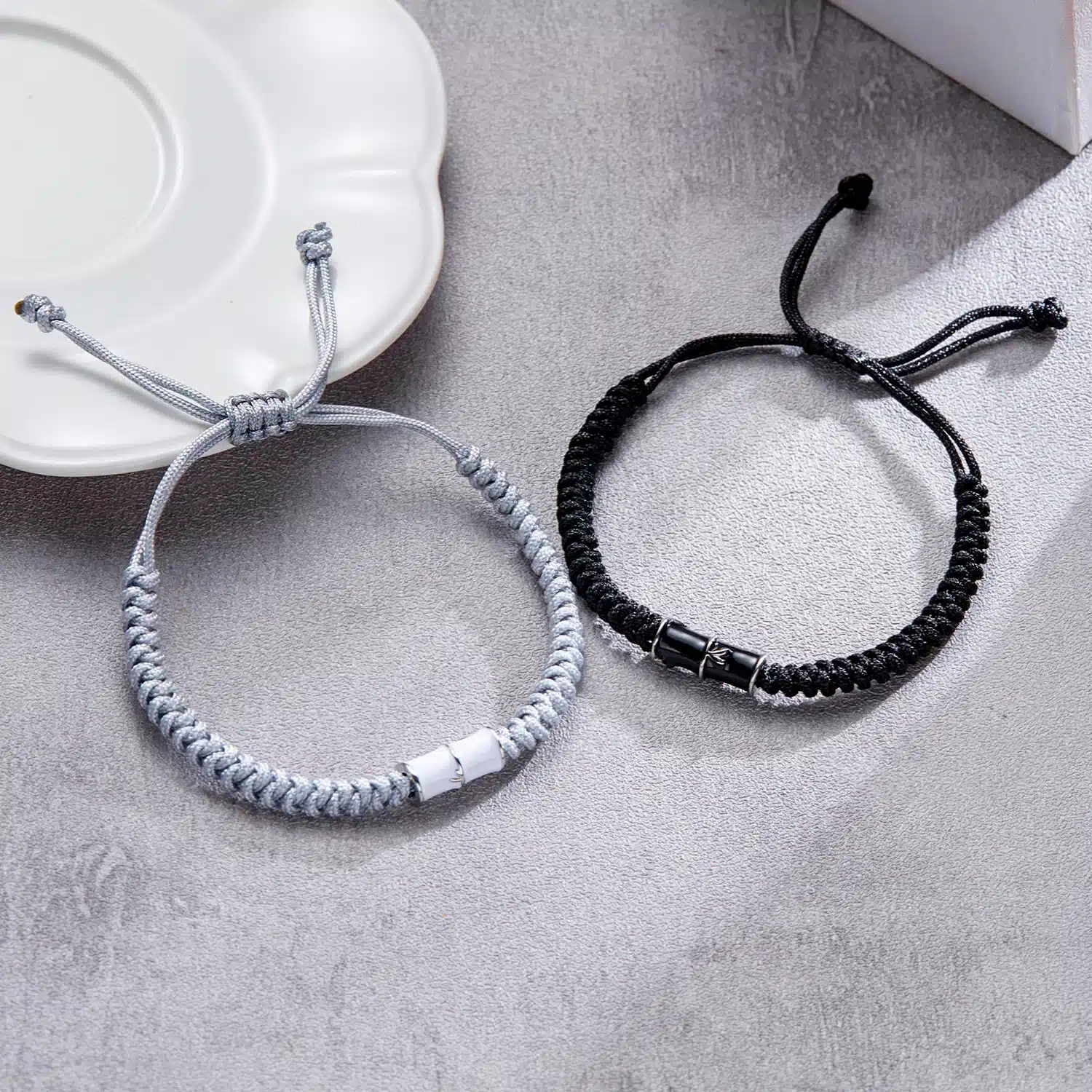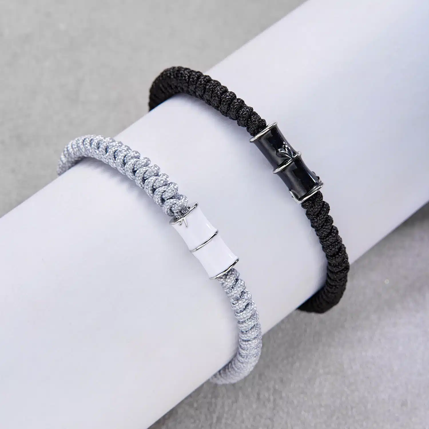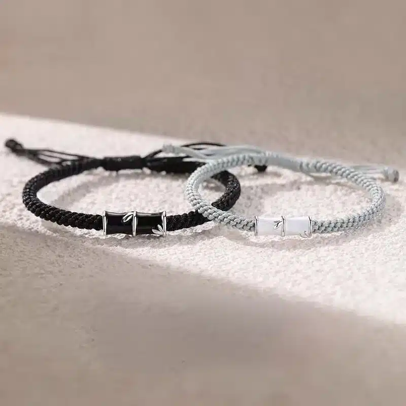 Chaque bracelet est composé d’un cordon tressé fin, décliné en noir profond pour l’un et en blanc/gris clair pour l’autre, avec un élément central façon bambou qui apporte une touche graphique et moderne.