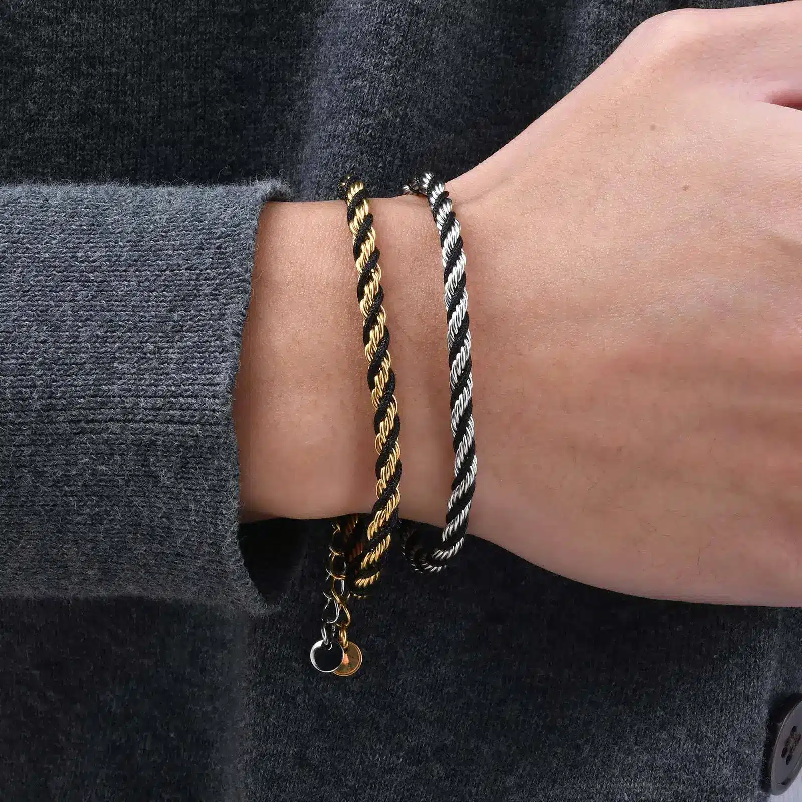 Chaque bracelet est composé d’un cordon torsadé mêlant des teintes argentées et dorées, créant un contraste raffiné et équilibré.
