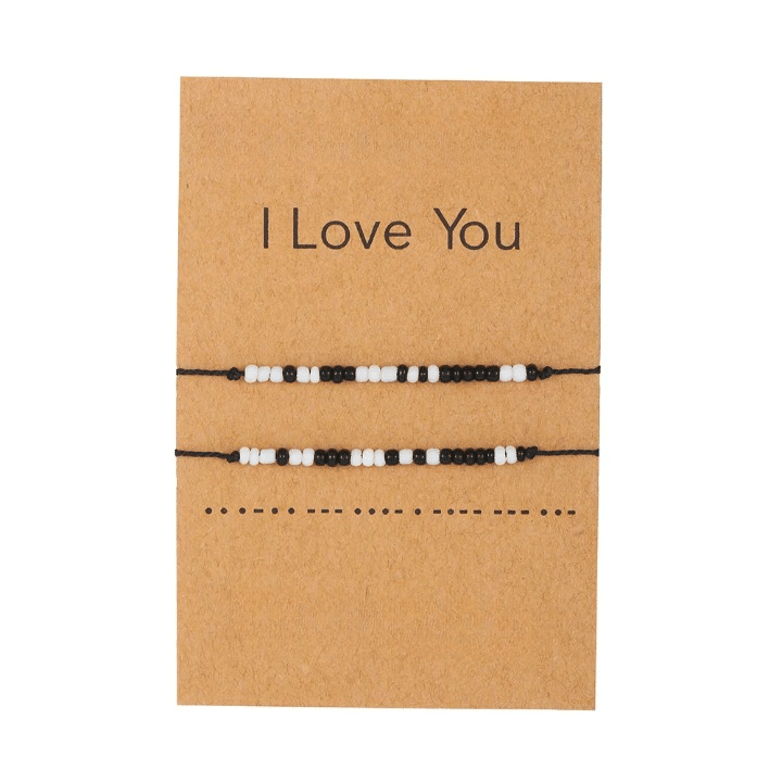Le message “I Love You” (Je t’aime) est inscrit en code morse à l’aide de petites perles noires et blanches, pour que seuls vous et votre moitié sachiez ce qu’il signifie.