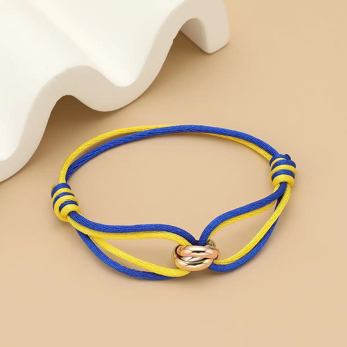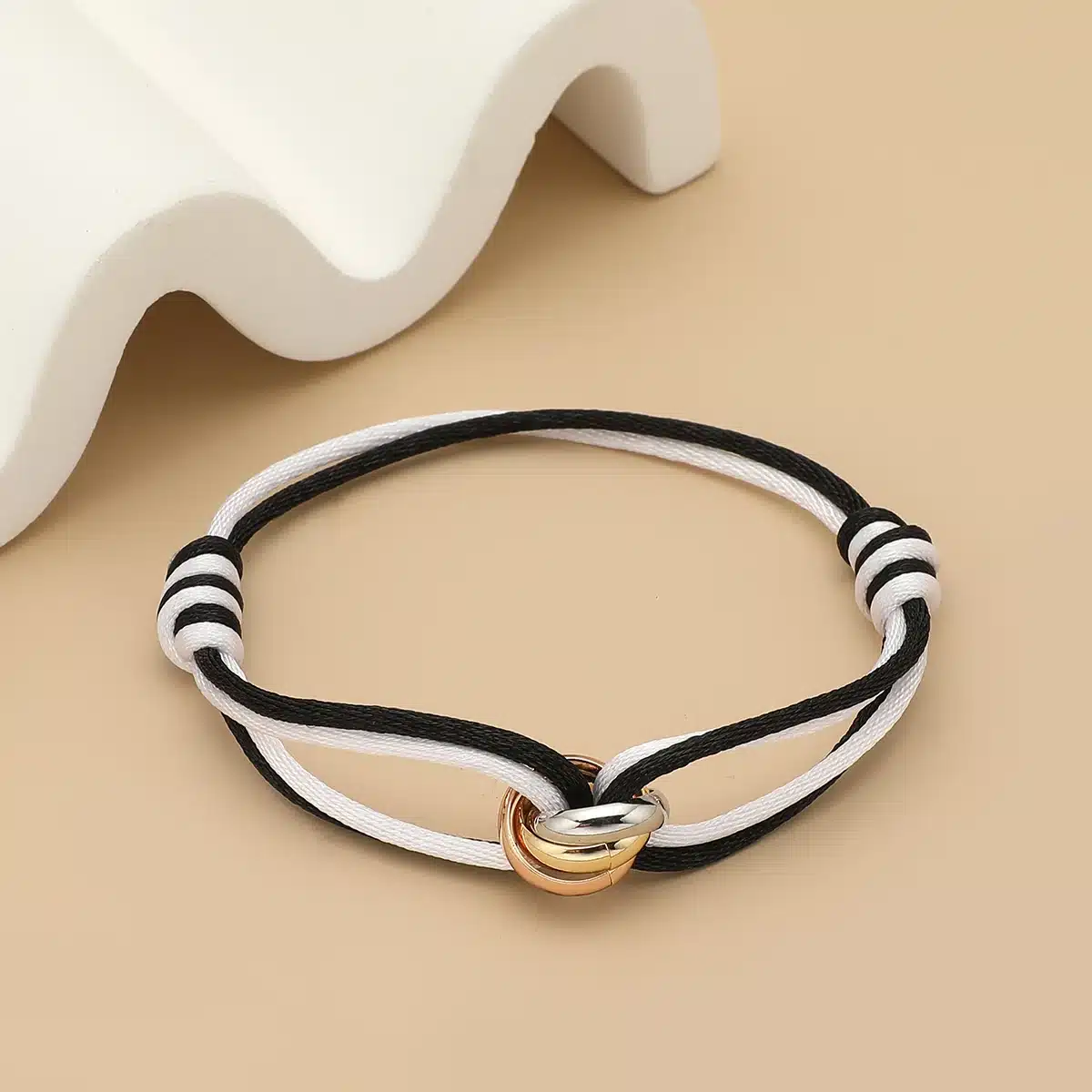 Fabriqué en cordon de coton doux et résistant, il se distingue par son nœud central orné de deux anneaux entrelacés en acier inoxydable : l’un doré, l’autre argenté.