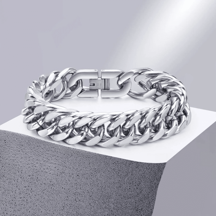 Fabriqué en acier inoxydable plaqué argent, ce Bracelet Couple Cubain Homme résiste à l’usure, ne ternit pas et conserve son éclat avec le temps.