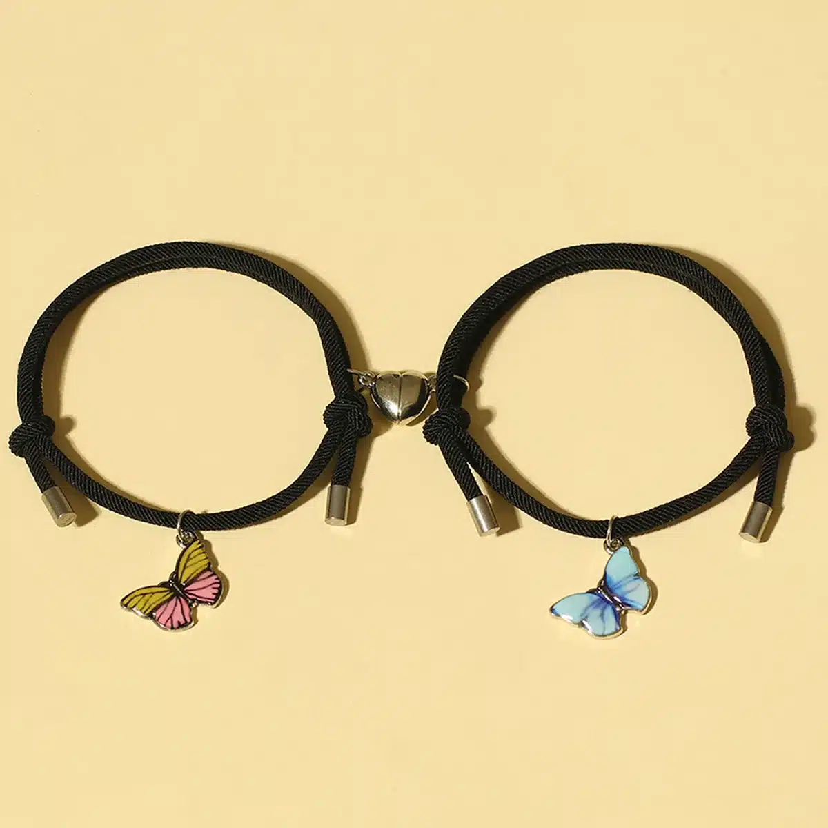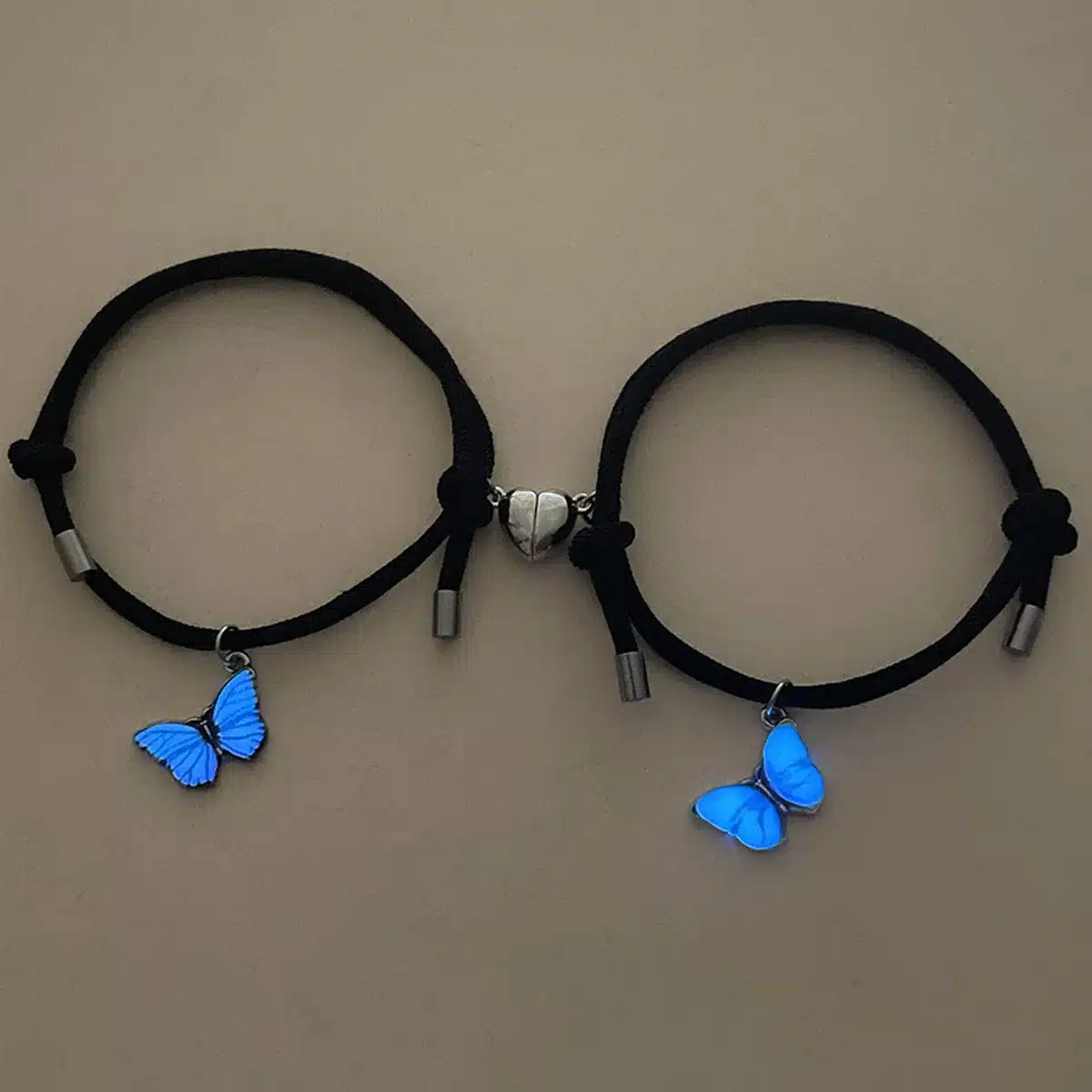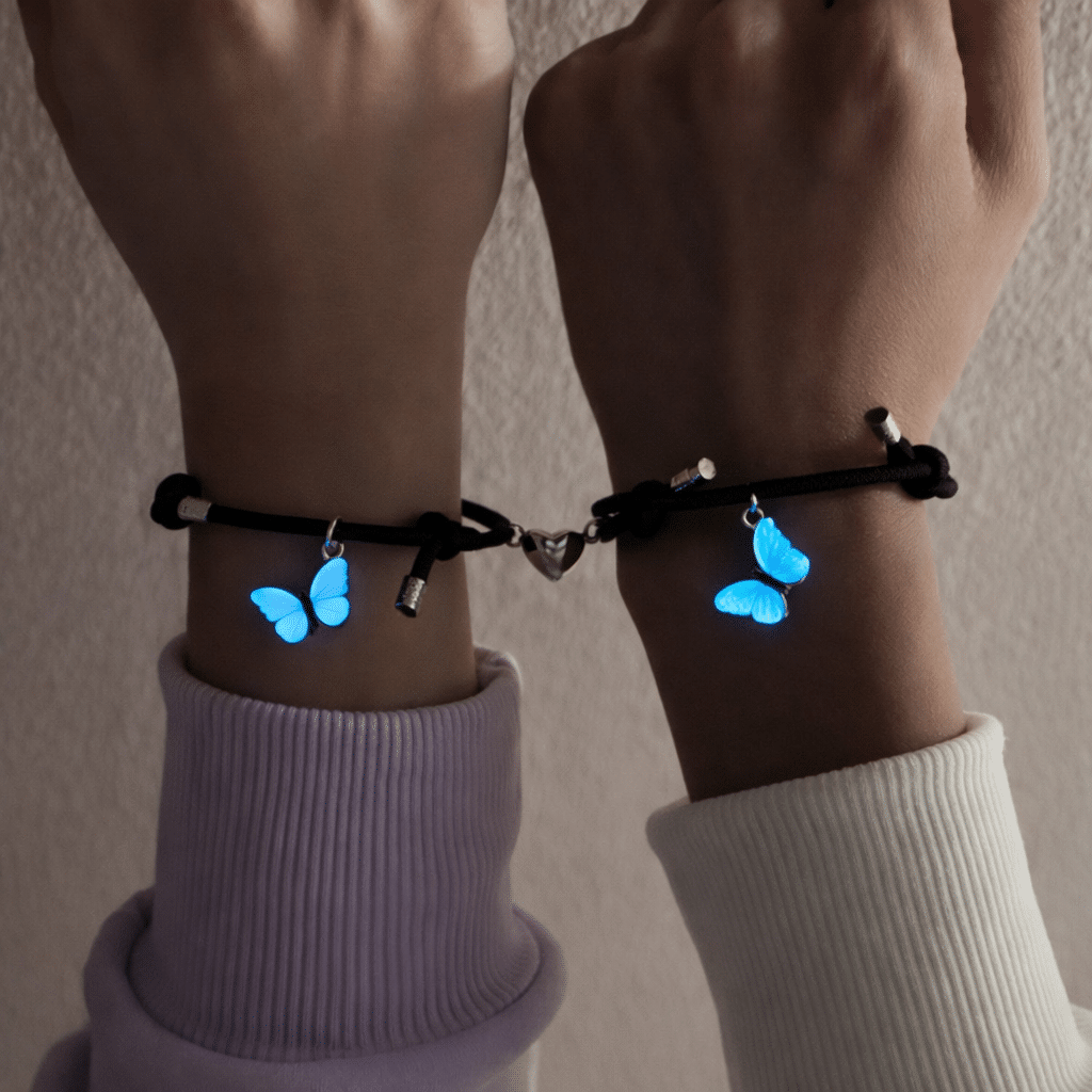 Chaque bracelet couple distance ajustable dispose d’un pendentif charm papillon qui brille bleu dans le noir, créant une lueur magique quand la nuit tombe.