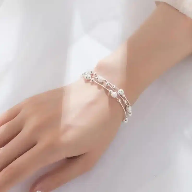 Ce bracelet couple femme amour argent se compose de plusieurs chaînes souples superposées qui créent un effet de profondeur élégant au poignet.