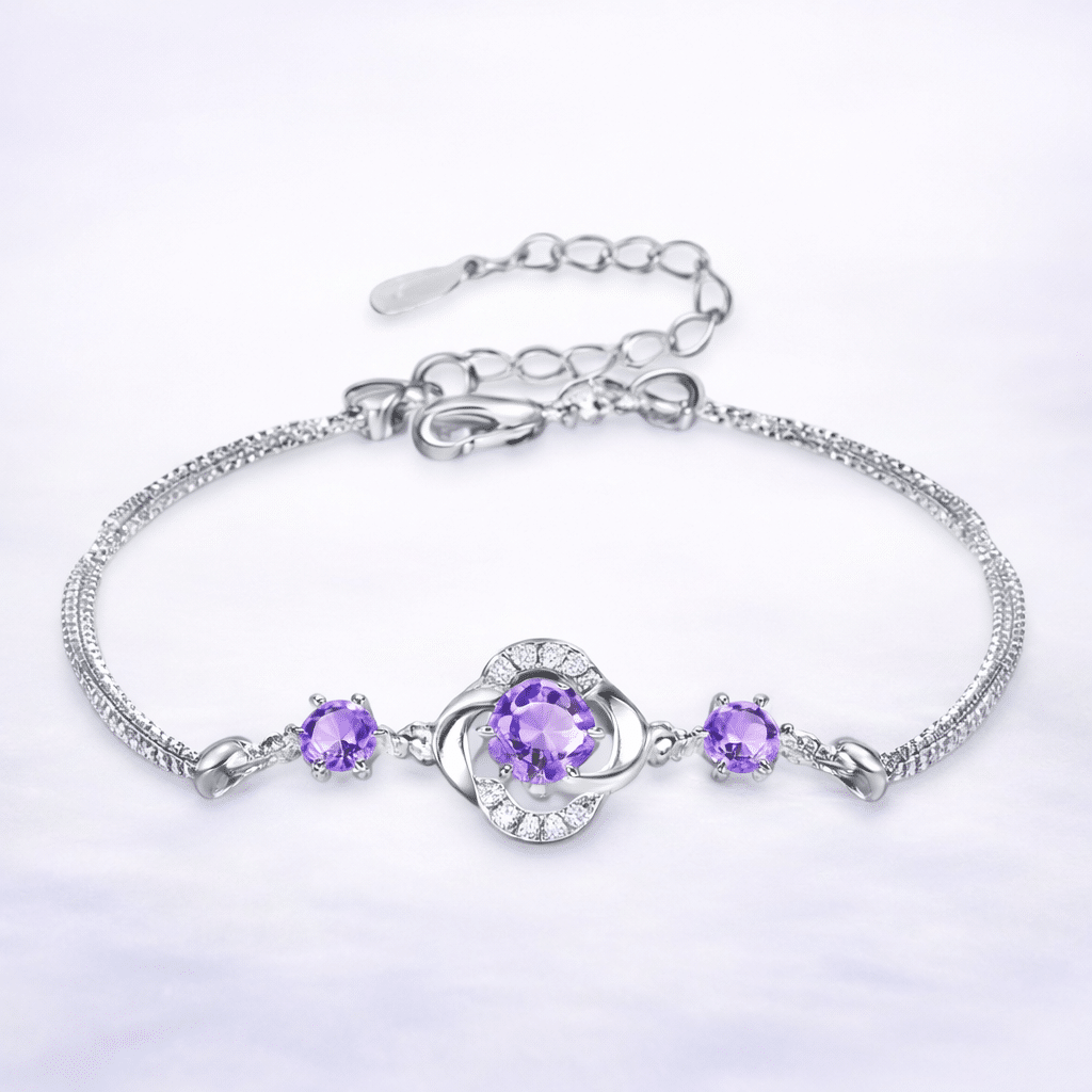 Ce bracelet couple femme fleur violette attire le regard avec son motif floral délicat et sa pierre violette centrale qui apportent une touche de couleur douce et féminine au poignet.