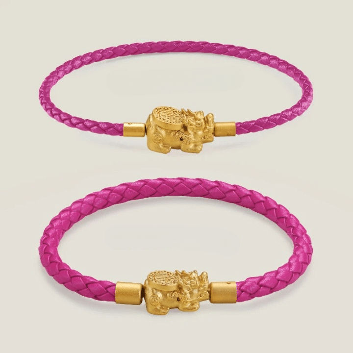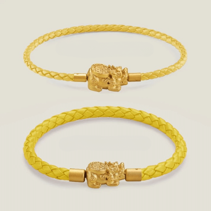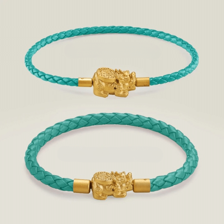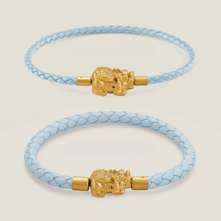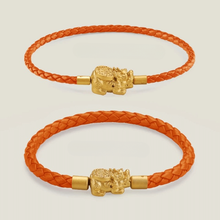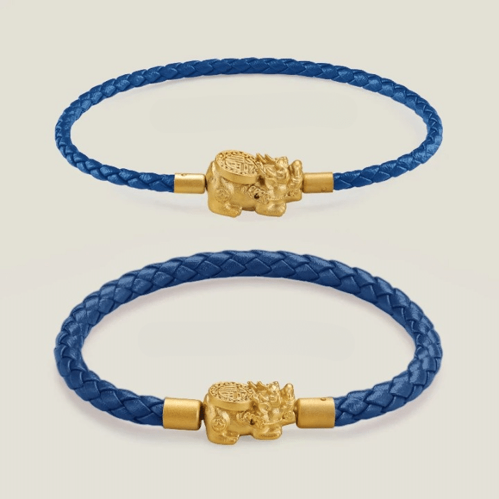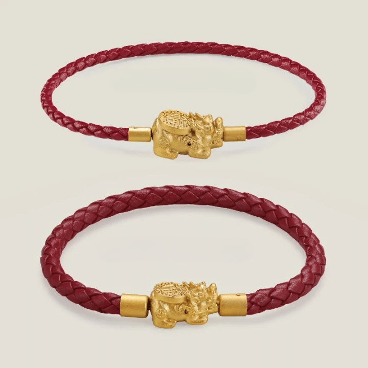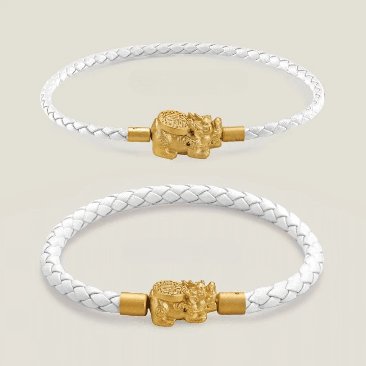 Au centre du bracelet couple feng shui, vous trouvez un Pixiu doré finement sculpté.