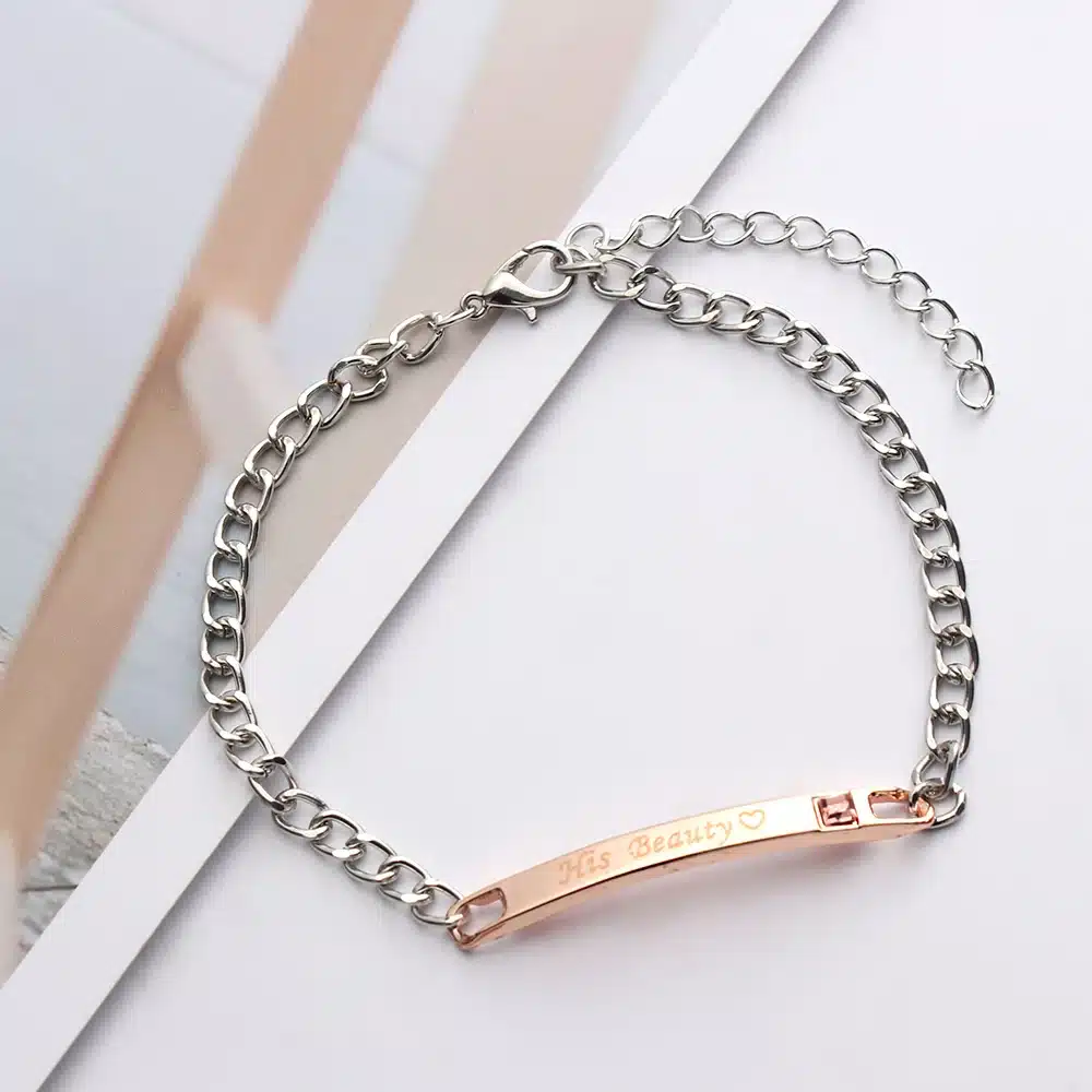 Au centre, chaque bracelet possède une plaque rectangulaire avec les inscriptions « Her Beauty » et « His Beast », pour garder un message complice au poignet.
