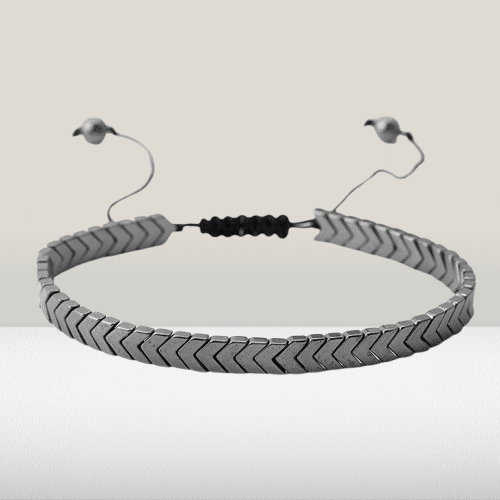 Chaque bracelet est composé de petits chevrons métalliques qui forment une ligne continue autour du poignet.