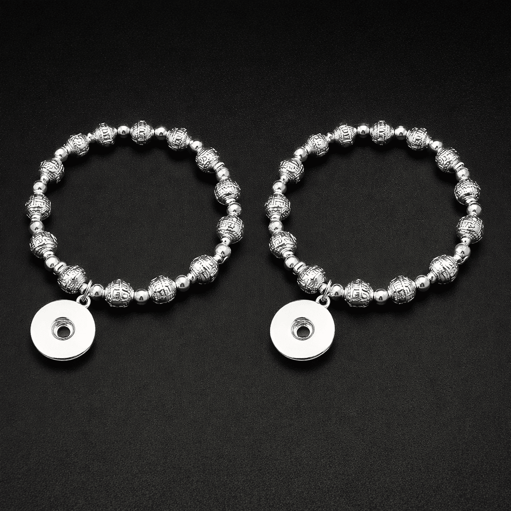 Le bracelet couple perles acier est composé de perles métalliques alternant finitions lisses et gravées, ce qui crée un contraste visuel moderne et élégant au poignet.