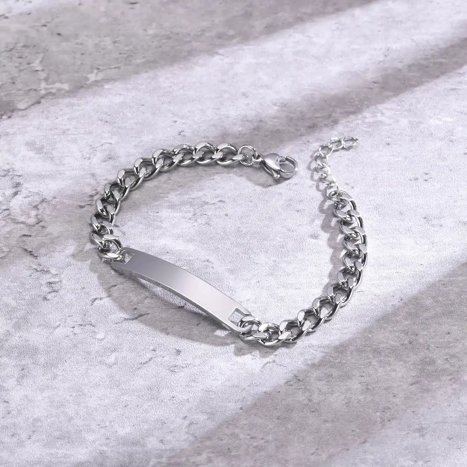 Le bracelet couple personnalisé homme femme associe une chaîne en acier inoxydable plaqué argent pensée pour offrir une bonne résistance et un port agréable au quotidien.