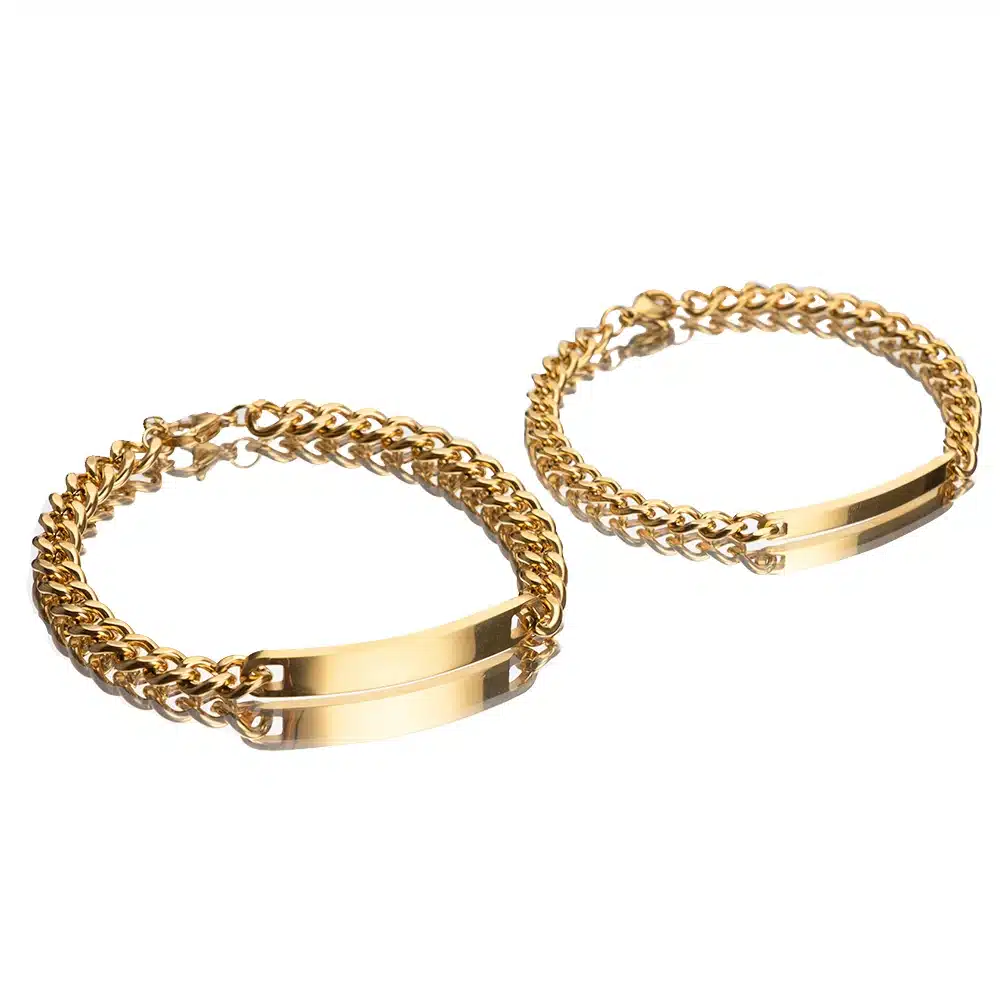 Le bracelet couple personnalisé rose éternelle est proposé en lot de deux avec une chaîne épaisse solide et une plaque centrale à graver avec un prénom, une date ou un mot symbolique.