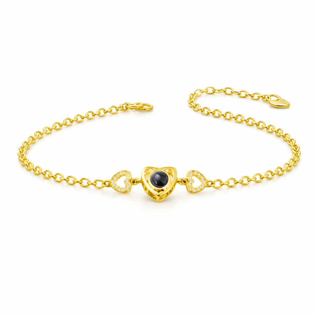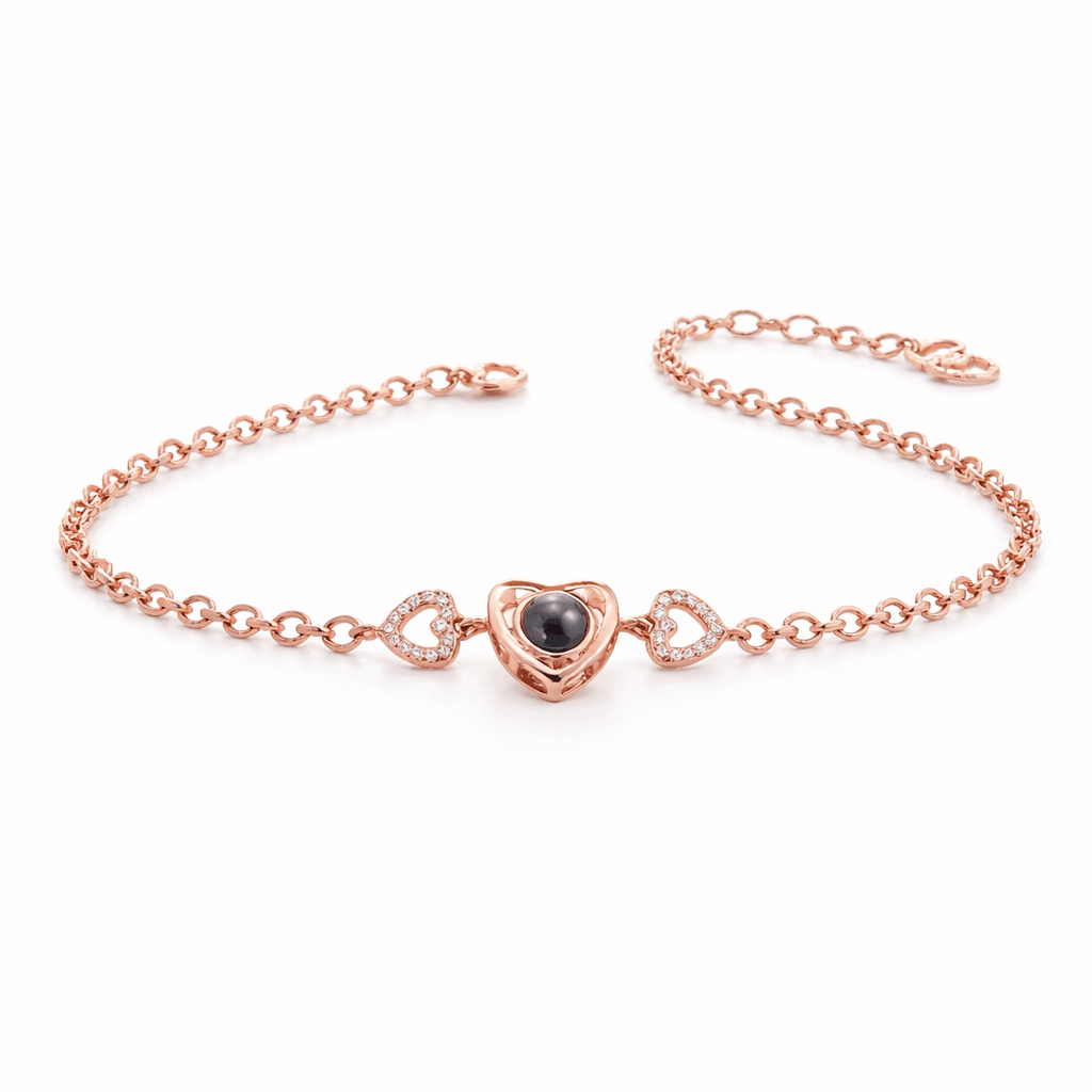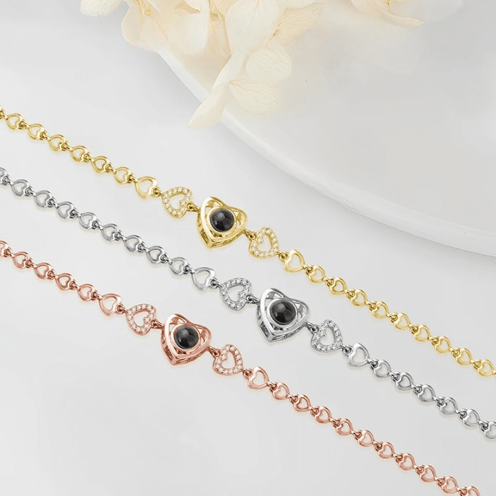 Le bracelet couple photo projection coeur pour femme est disponible en trois finitions : doré, rose gold ou argent, pour s’adapter à tous les styles.