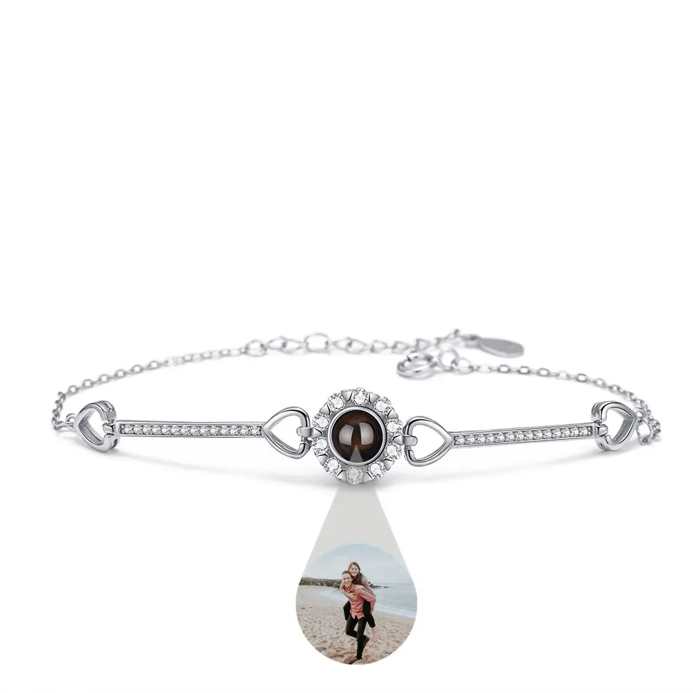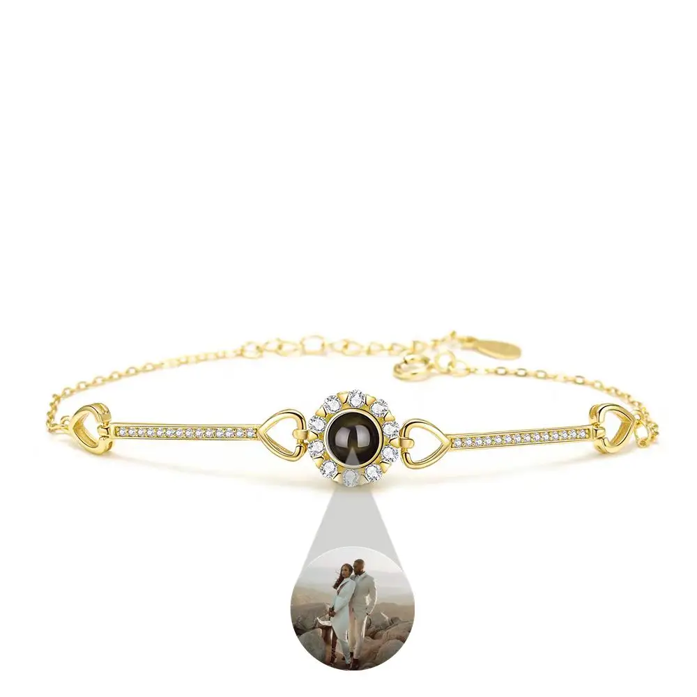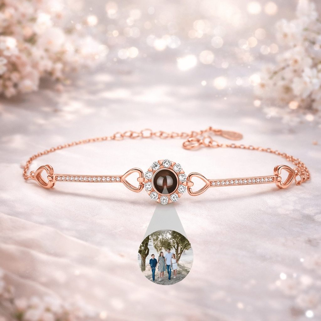 Ce bracelet couple photo projection femme brillant contient un médaillon central qui projette une photo personnalisée, visible à l’œil nu, au flash ou avec la caméra de votre téléphone, pour garder un souvenir intime toujours avec soi.