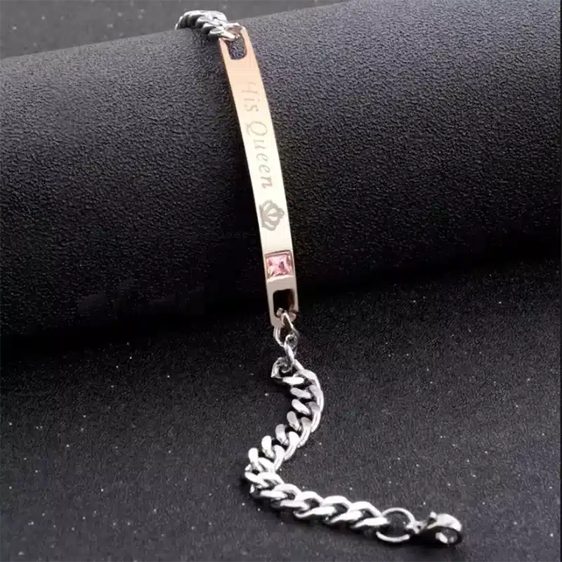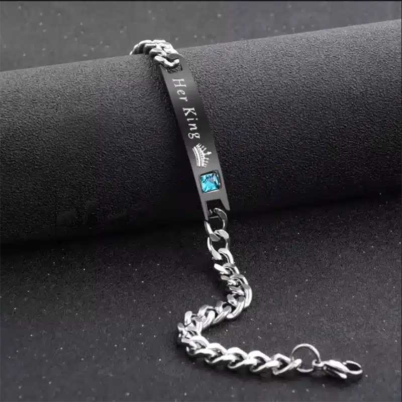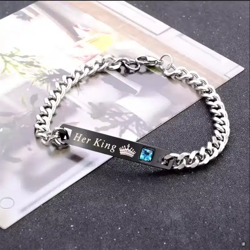 Au centre, chaque bracelet affiche une plaque rectangulaire avec l’inscription « Her King » et « His Queen », accompagnée d’un détail en zirconium brillant qui apporte une touche lumineuse au bijou.