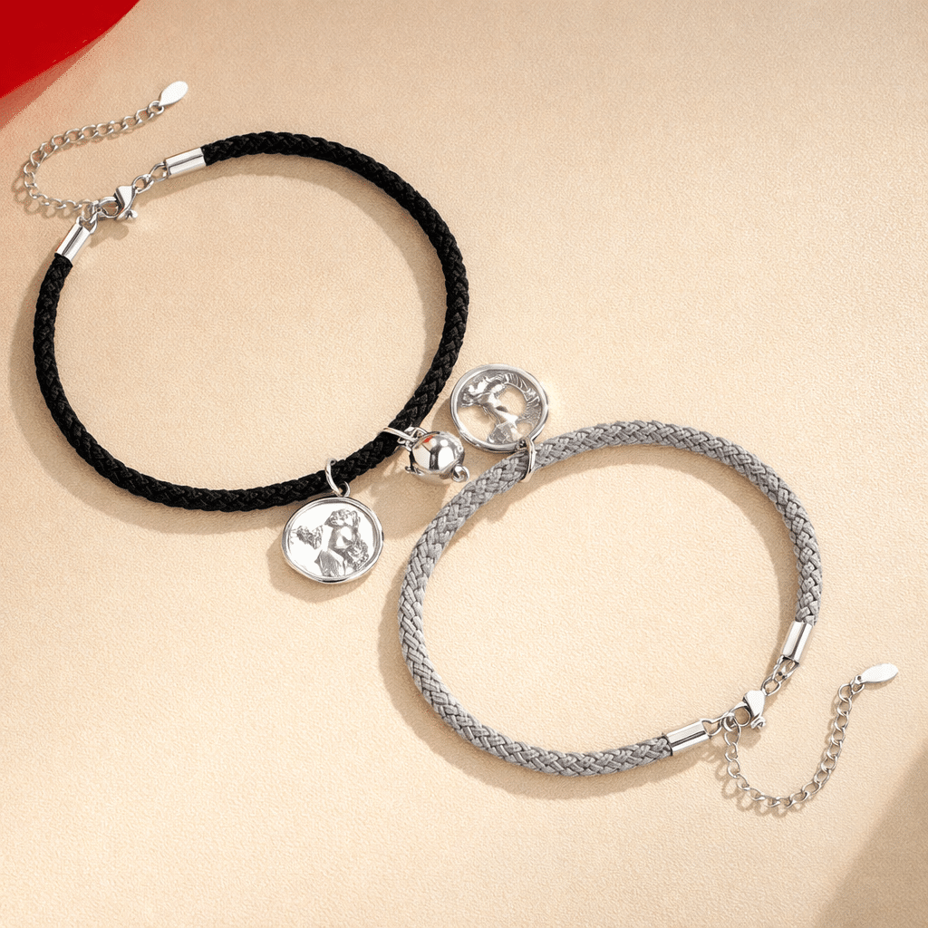 Chaque bracelet porte un charm en demi-sphère aimantée qui se connecte à l’autre pour former une sphère complète, symbole discret mais fort du lien entre vous deux.