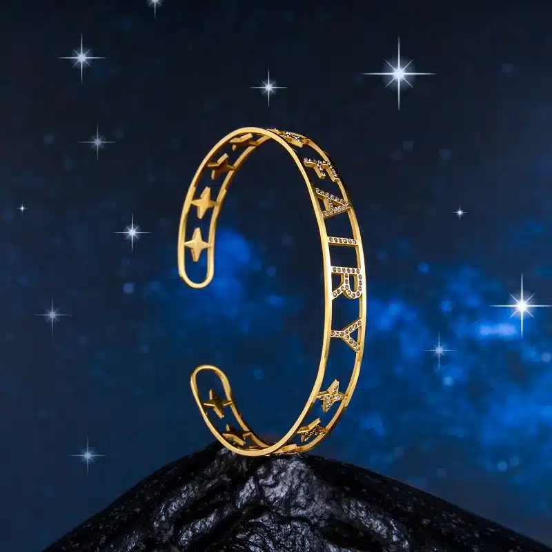 Le bracelet prénom personnalisé femme ajouré est fabriqué en acier inoxydable, solide et résistant au quotidien, avec une finition dorée qui capte la lumière et apporte un éclat élégant au poignet.