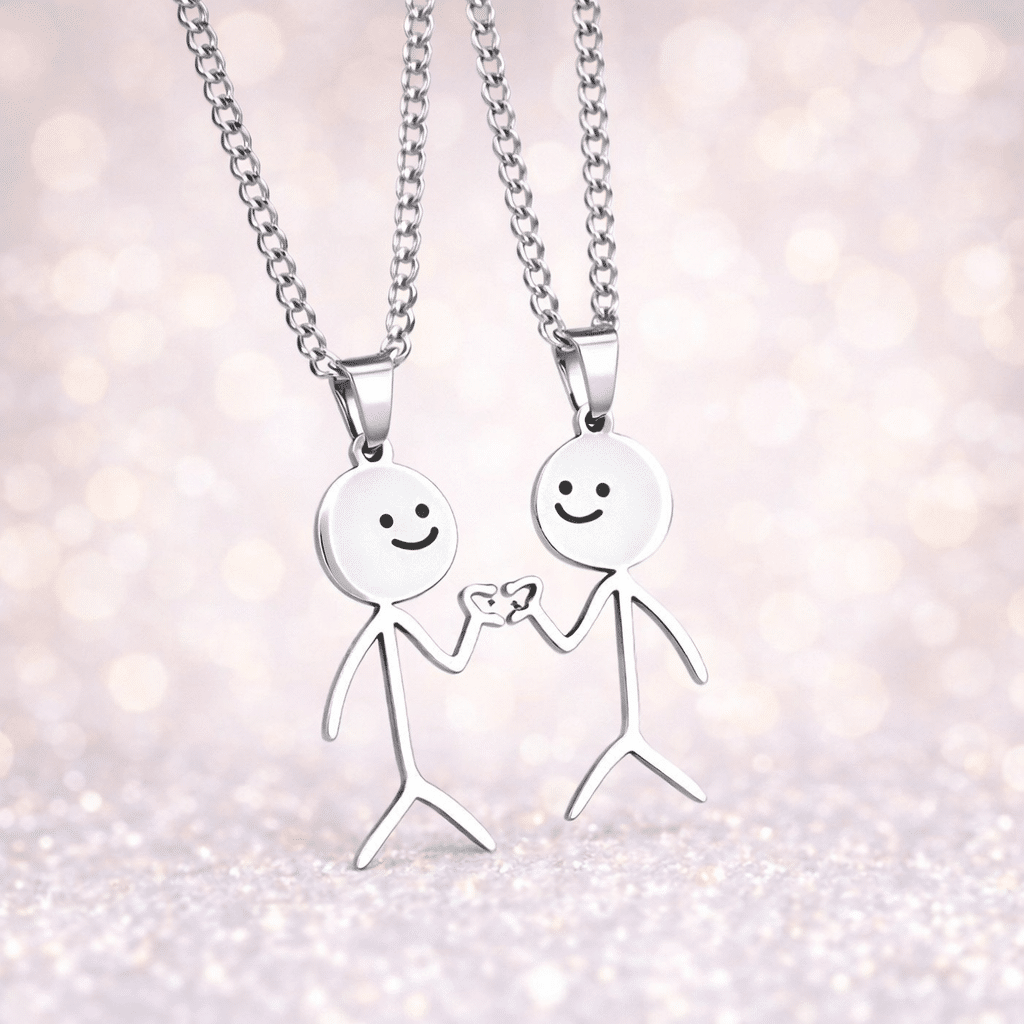 Ce lot de deux colliers couple met en scène deux bonhommes dessinés façon stickman, reliés par les doigts dans un geste tendre et complice.