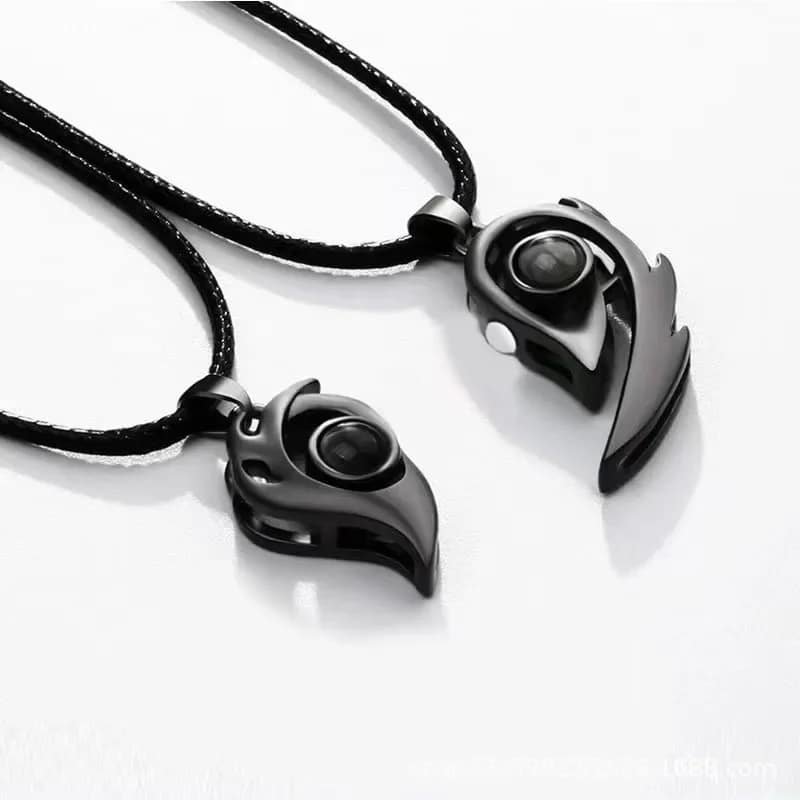 Les deux pendentifs sont magnétiques et s’emboîtent parfaitement quand vous les rapprochez, comme un symbole de votre union.