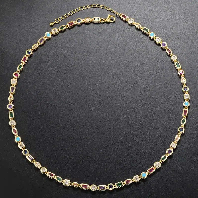 Les petites pierres colorées espacées le long du bijou apportent des touches pastel qui jouent avec la lumière et rappellent la diversité des émotions dans une relation.