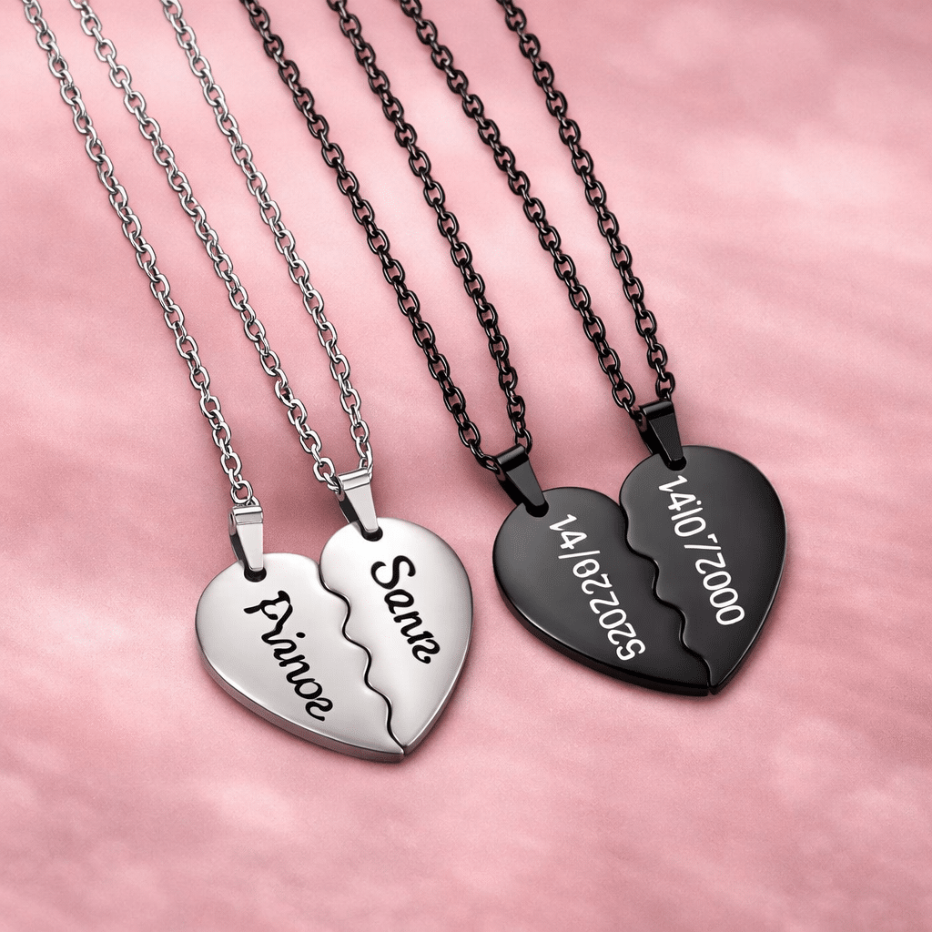 Le plus beau dans ce collier cœur couple gravé, c’est la gravure personnalisée de vos prénoms avec un prénom sur chaque pendentif demi-cœur.