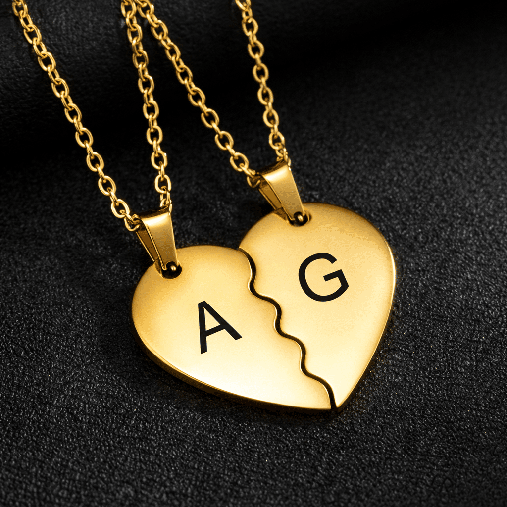 Sur chaque moitié de cœur, nous gravons un prénom personnalisé qui vous tient à cœur, transformant ces colliers cœur couple initiale en un symbole unique de votre lien.