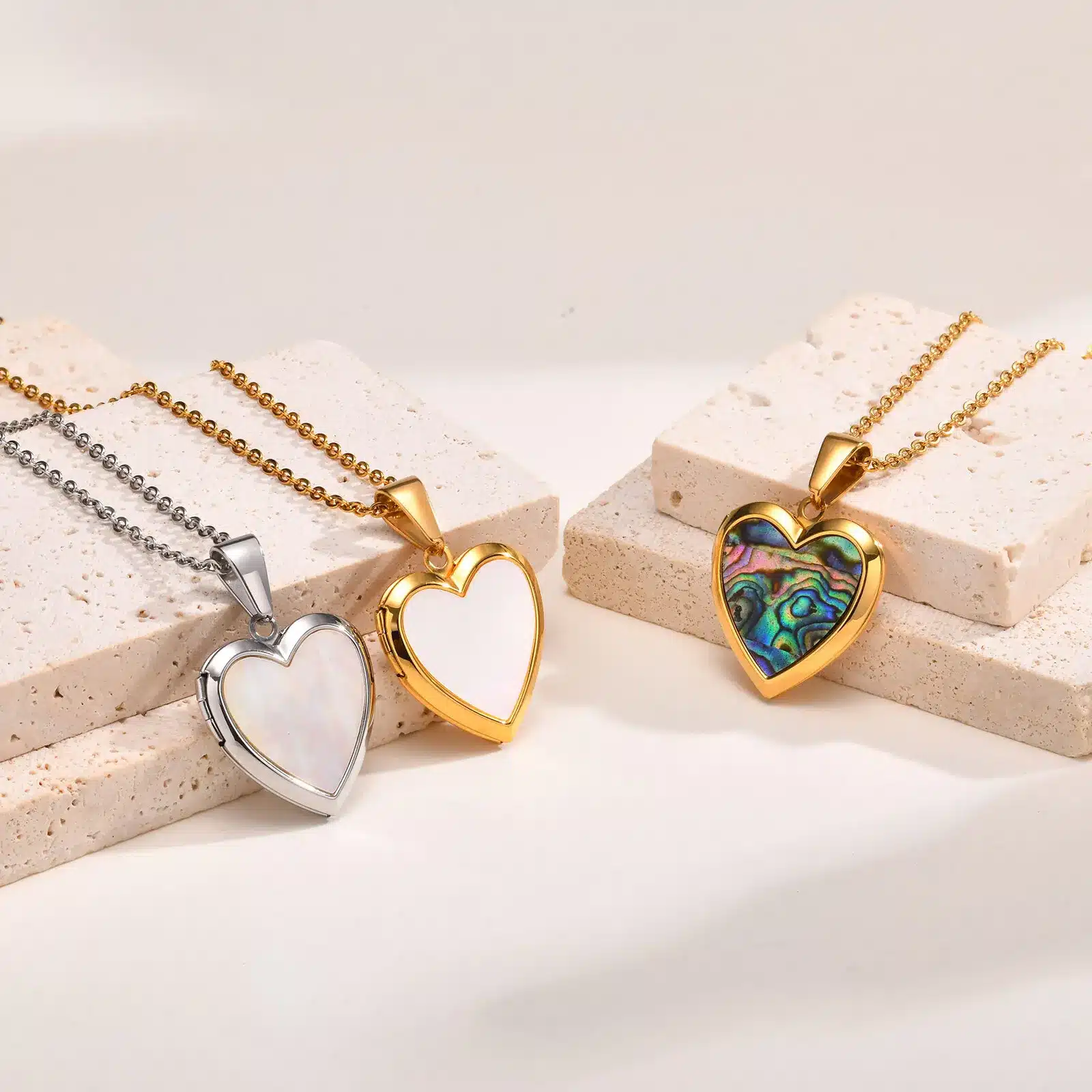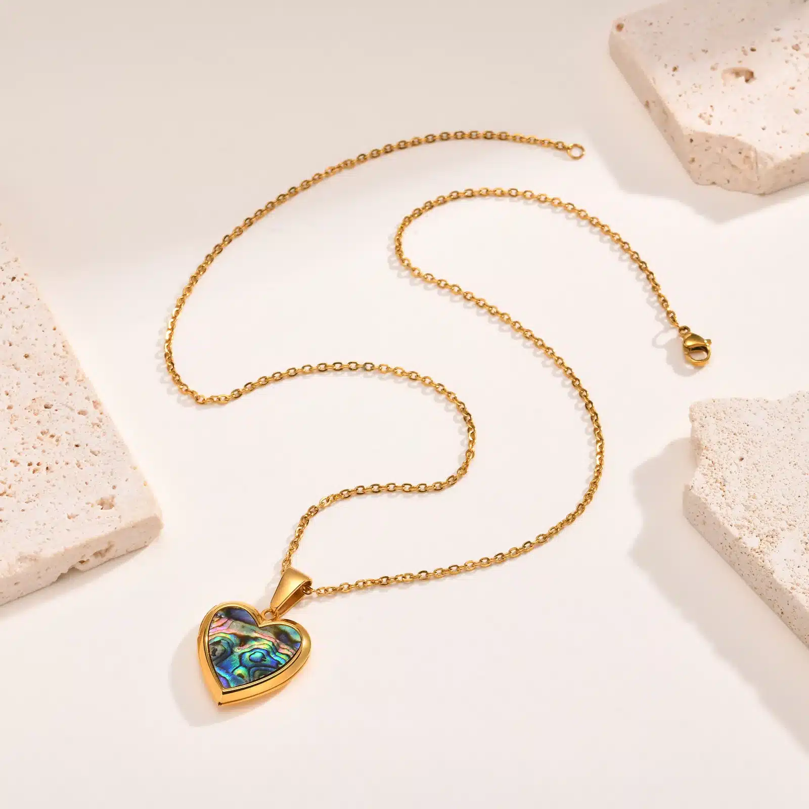 Le pendentif cœur en nacre attire le regard avec un reflet doux qui change selon la lumière.