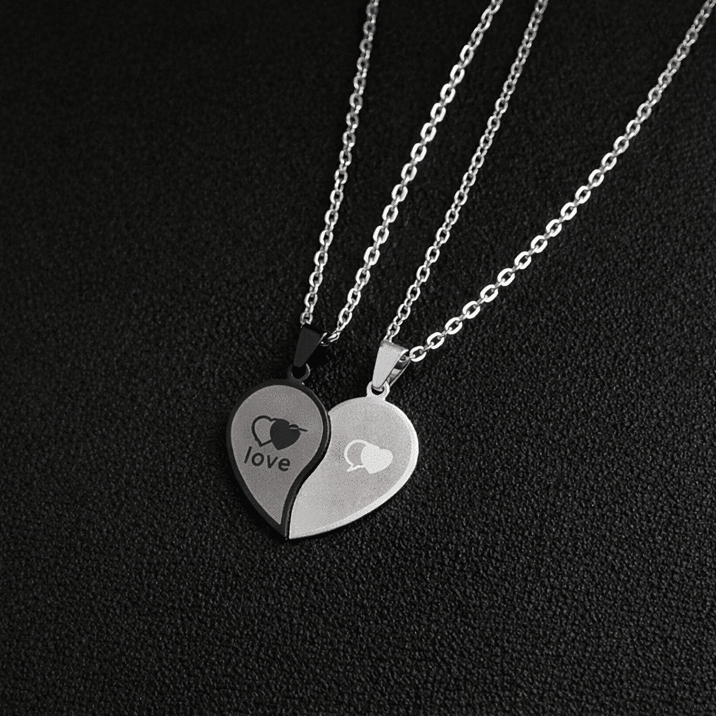 Chaque collier porte une moitié de cœur qui s’emboîte parfaitement avec l’autre pour former un cœur complet.