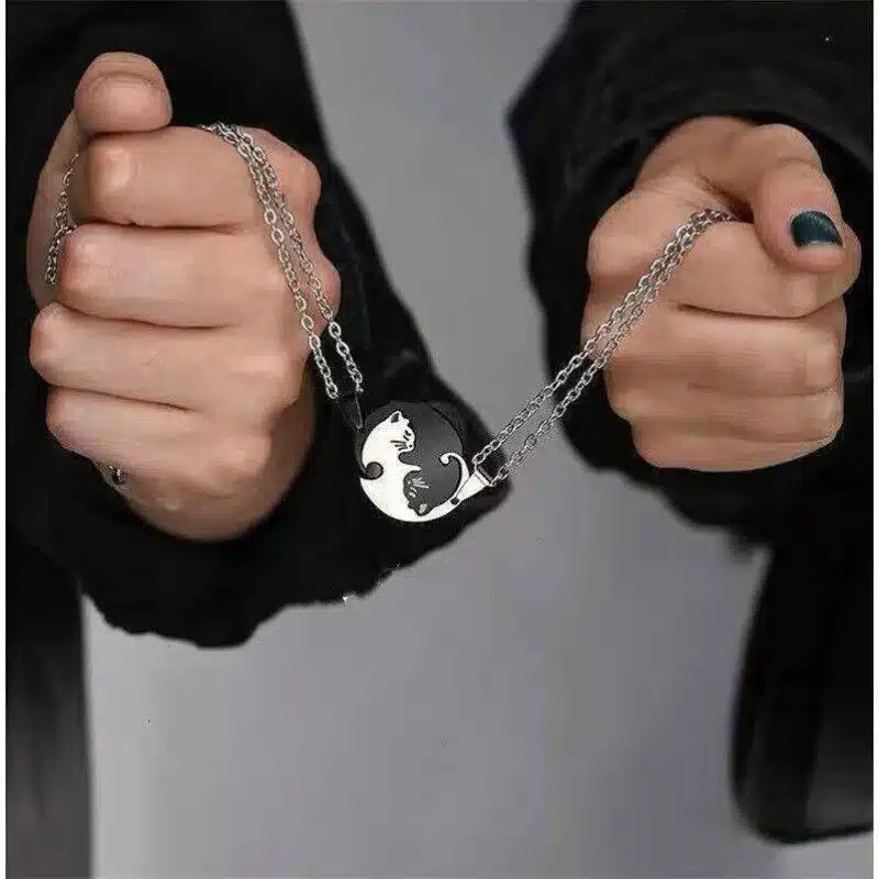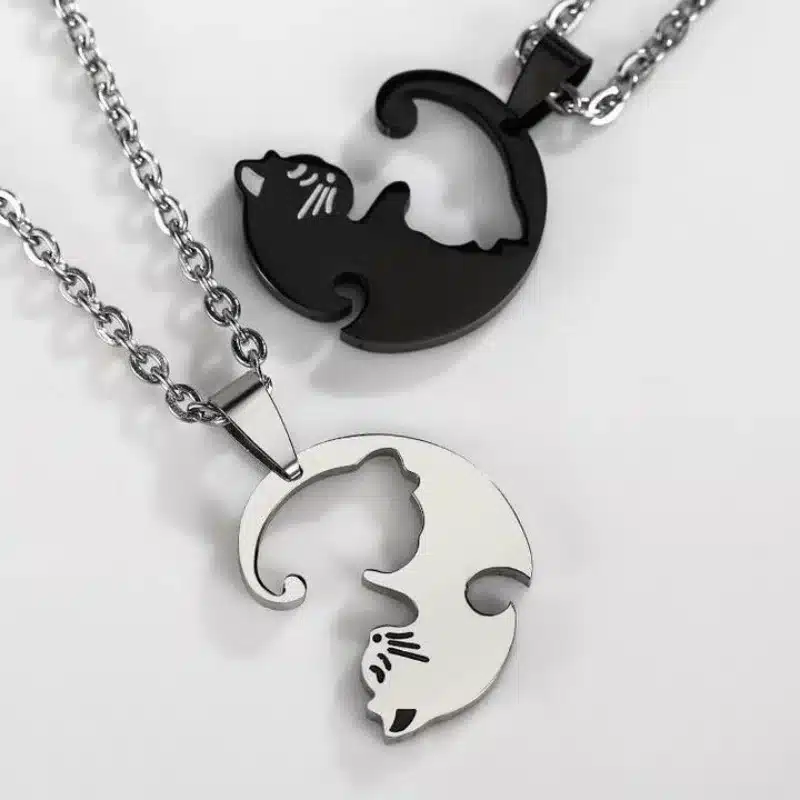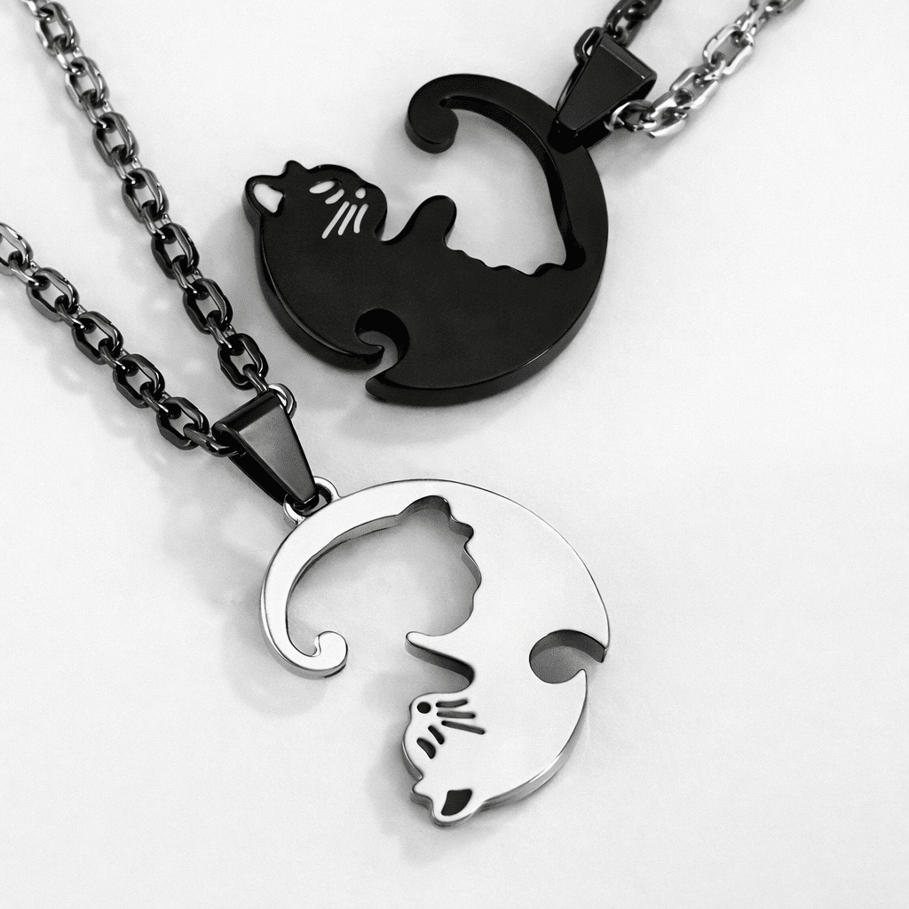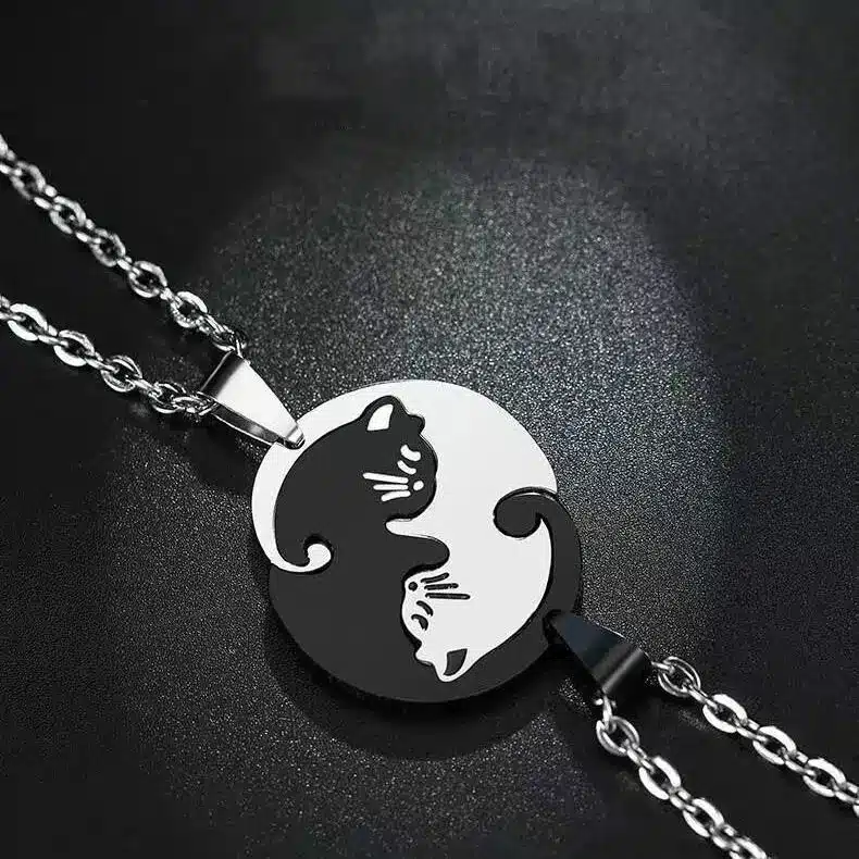 Ce lot de colliers couple animaux représente deux chats complémentaires, l’un noir et l’autre argenté, imbriqués dans un design circulaire inspiré du symbole du yin et du yang.