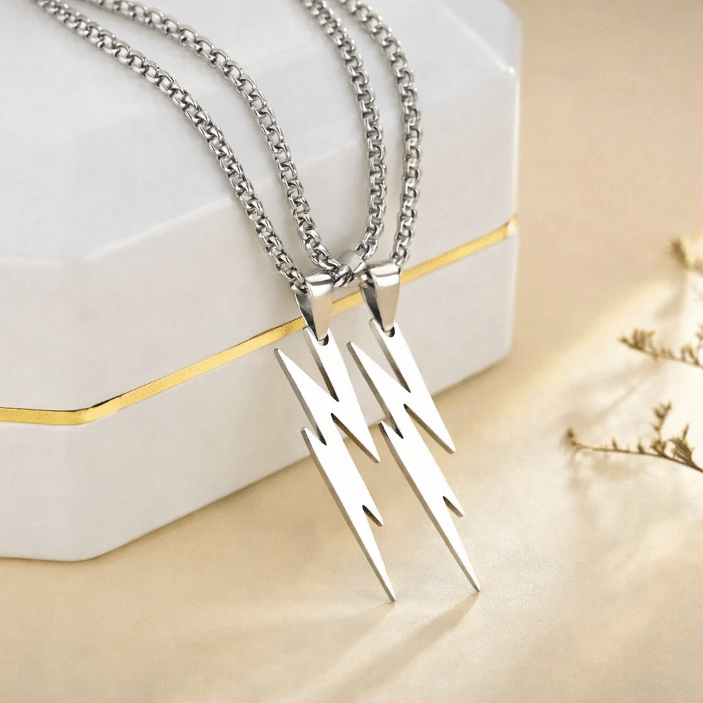 Ce lot de colliers couple propose un pendentif au design original en forme de double éclair stylisé, à la fois minimaliste et percutant.
