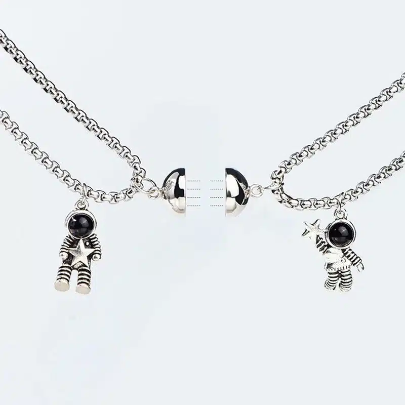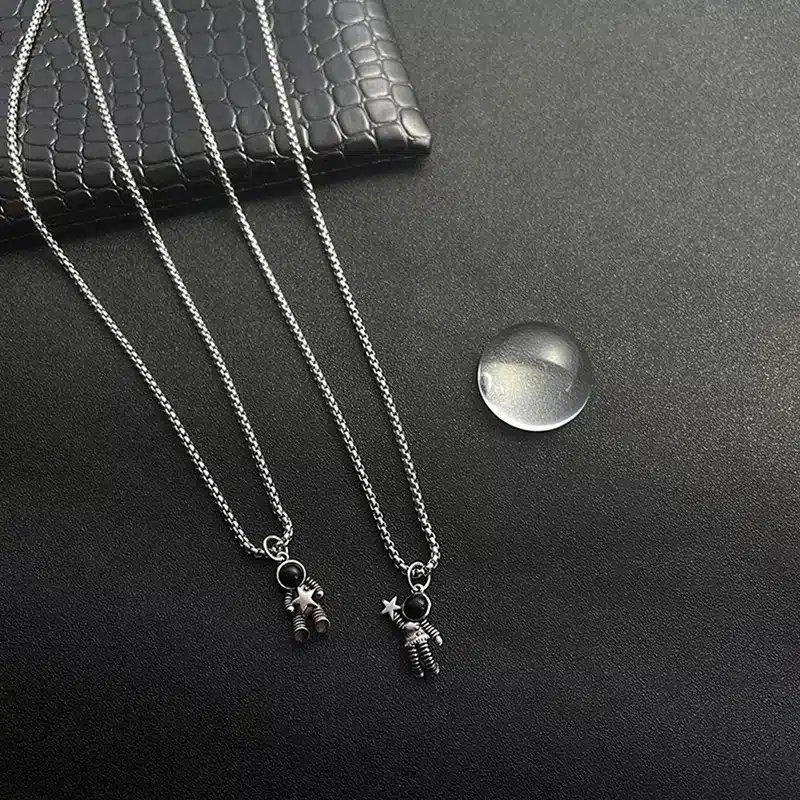 Ce lot de deux colliers couple célèbre les rêves partagés à travers deux pendentifs originaux en forme d’astronautes miniatures.