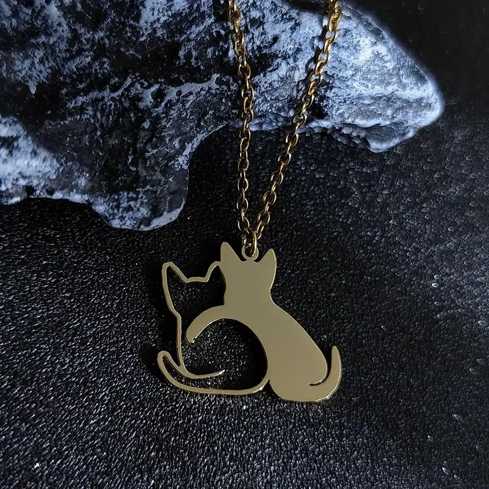 Ce collier couple chat câlin pour femme représente deux chats enlacés qui forment une silhouette tendre, symbole de l’attachement et de la complicité entre deux personnes.